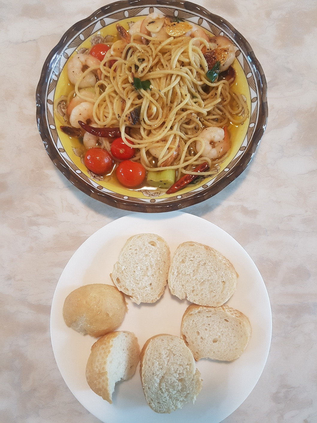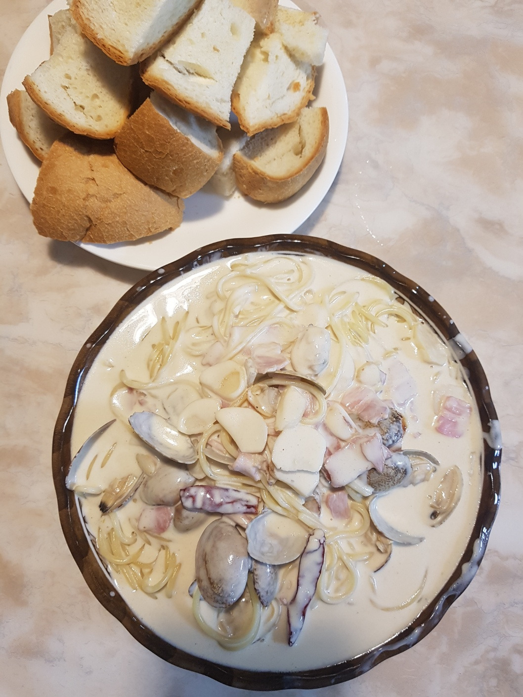 봉골레 빠네 파스타는 빵은 가로로 잘라 아래 부분은 속을 파냈어야 하는데 그냥 다 잘라서 스파게티 소스에 찍어먹는 것으로 종결.