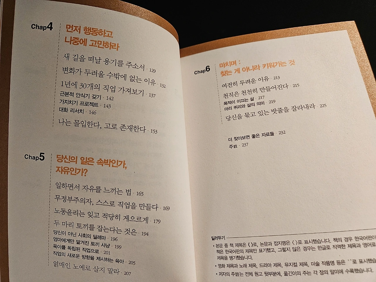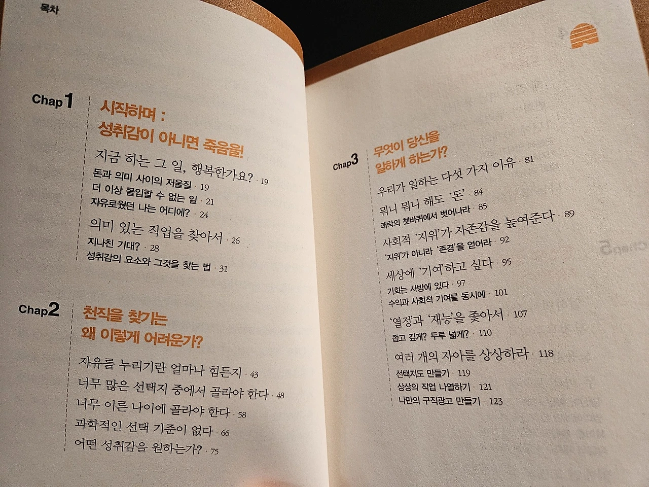 이 책에서는 두 가지 필수 질문을 한 데 섞어 탐색해 보겠다. ‘성취감을 느끼게 해주는 직업의 핵심요소는 무엇인가?’가 첫 번째 질문이다. 우리가 일에서 실제로 기대하는 것을 알아야 하는데, 거기에는 세 가지 본질적인 요소가 존재한다. 바로 의미와 몰입, 자유다. (p.35)
