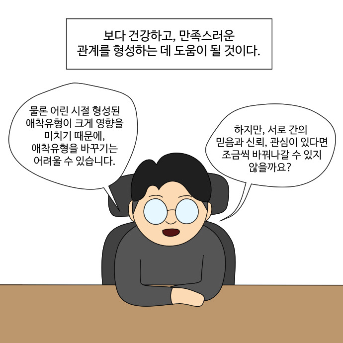 애착유형이라는 심리학적 지식이 우리 삶을 더 행복하게 만들어 줄 수 있길 바라며 이번 화를 마치겠습니다.
