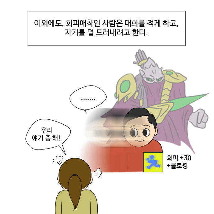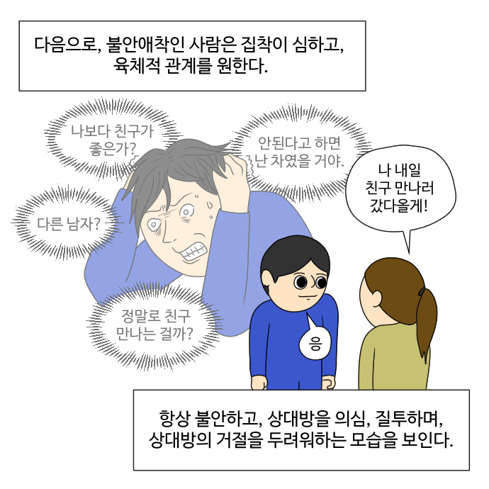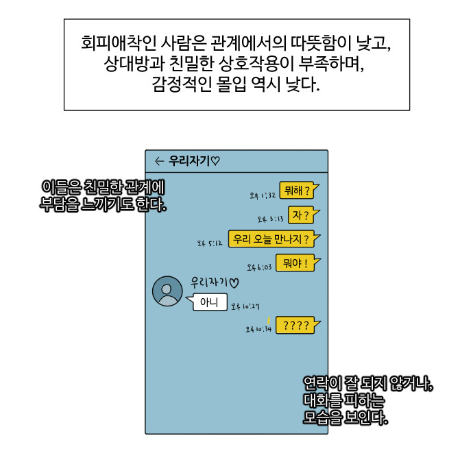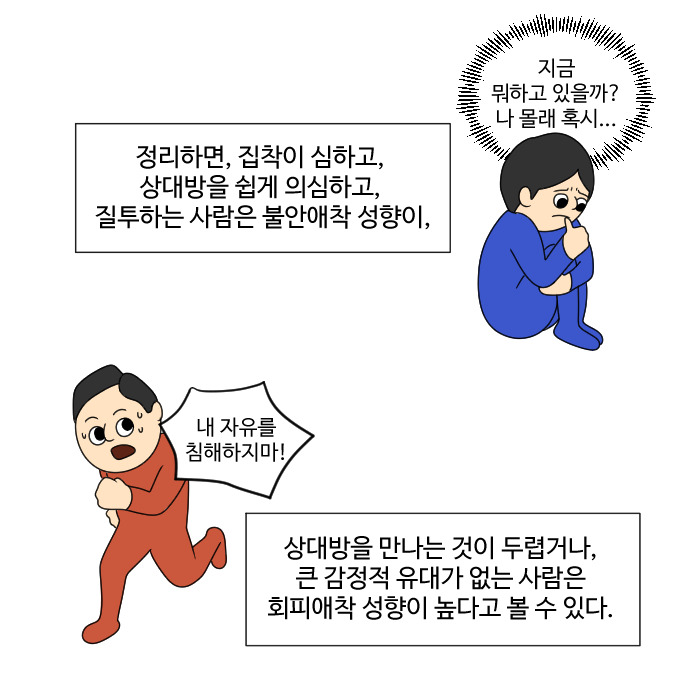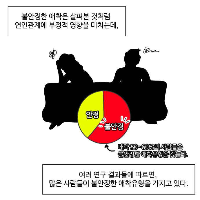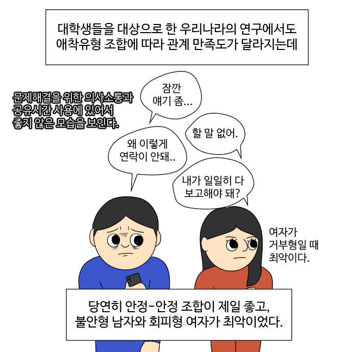 싸우기만 하면 동굴로 들어가는 남자 친구는 회피애착, 내 일거수일투족을 궁금해하는 여자 친구는 불안애착 성향이 높다는 것을 이번 레토르트 심리학을 통해 유추해볼 수 있습니다. 안정애착이 아닌 불안정한 애착유형을 가지고 있는 경우에, 연인관계에서 다양한 갈등들이 발생하게 됩니다. 불안애착 성향이 높은 연인을 만나면, 상대방이 자신을 심하게 구속한다는 느낌을 자주 받고, 상대방이 자신을 믿지 못하고 의심하는 경우를 많이 마주치게 됩니다. 반면에, 회피애착 성향이 높은 연인을 만나면, 상대방과 깊이 있는 대화를 하기가 어렵고, 갈등 상황을 해결하기보다는 그냥 넘어가버리는 경우가 많이 생깁니다.