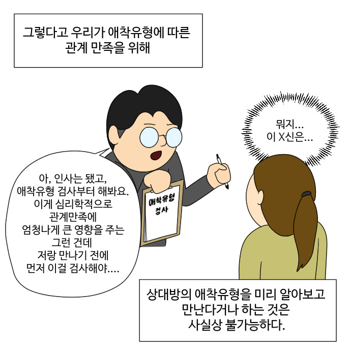 위에서 말씀드린 갈등의 종류는 한 가지 애착유형으로만 알아본 것이고, 성인애착유형은 안정형, 불안형, 회피-거부형, 회피-두려움형의 4가지로 나뉘기 때문에, 두 사람이 갖는 애착유형 조합의 경우의 수는 16가지에 이릅니다. 이렇게 다양한 조합에 따라 다양한 관계의 양상이 나타나기에 갈등의 원인을 찾아내고, 해결하는 것은 상당히 어려운 일처럼 보입니다. 하지만, 나와 상대방의 애착유형을 정확히 파악하고, 그에 따른 행동의 원인을 생각해본다면, 갈등 해결의 실마리를 찾을 수 있을 것입니다.