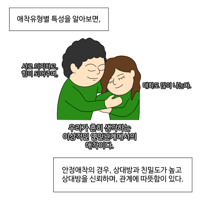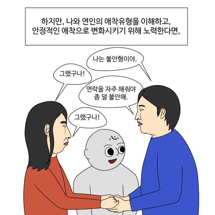 애착유형이라는 것이 어린 시절 주양육자(주로 부모님)와의 관계에서 형성되어, 이후의 삶에 영향을 미치는 것이기에, 애착유형을 근본적으로 바꾼다는 것은 어려운 일입니다. 다만, 안정애착을 형성하는 양육자의 태도를 생각하고, 이를 바탕으로 연인관계를 꾸려나가면 어떨까요? 연인의 요청에 항상 능동적으로 반응하고, 언제나 연인의 편에 서있다는 신뢰와 믿음을 준다면 적어도 연인 간에는 안정애착이 형성될 수 있을 것입니다. 근원적인 애착유형을 변화시키는 데에는 한계가 있겠지만, 새로운 관계에서는 새로운 애착을 형성할 수 있습니다.