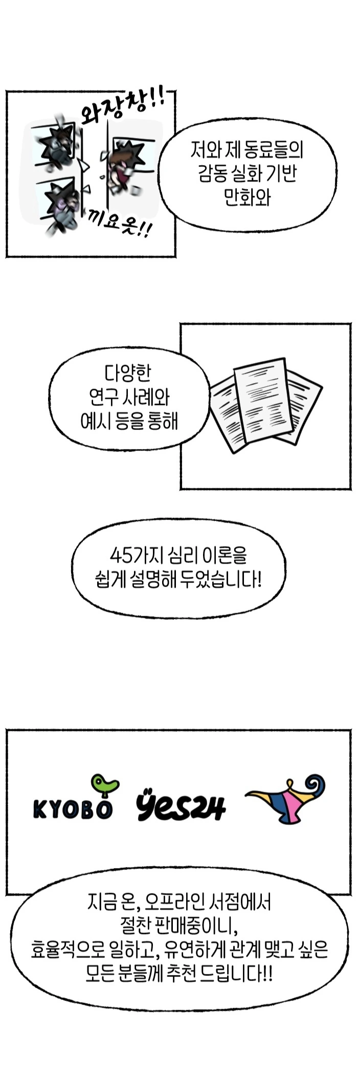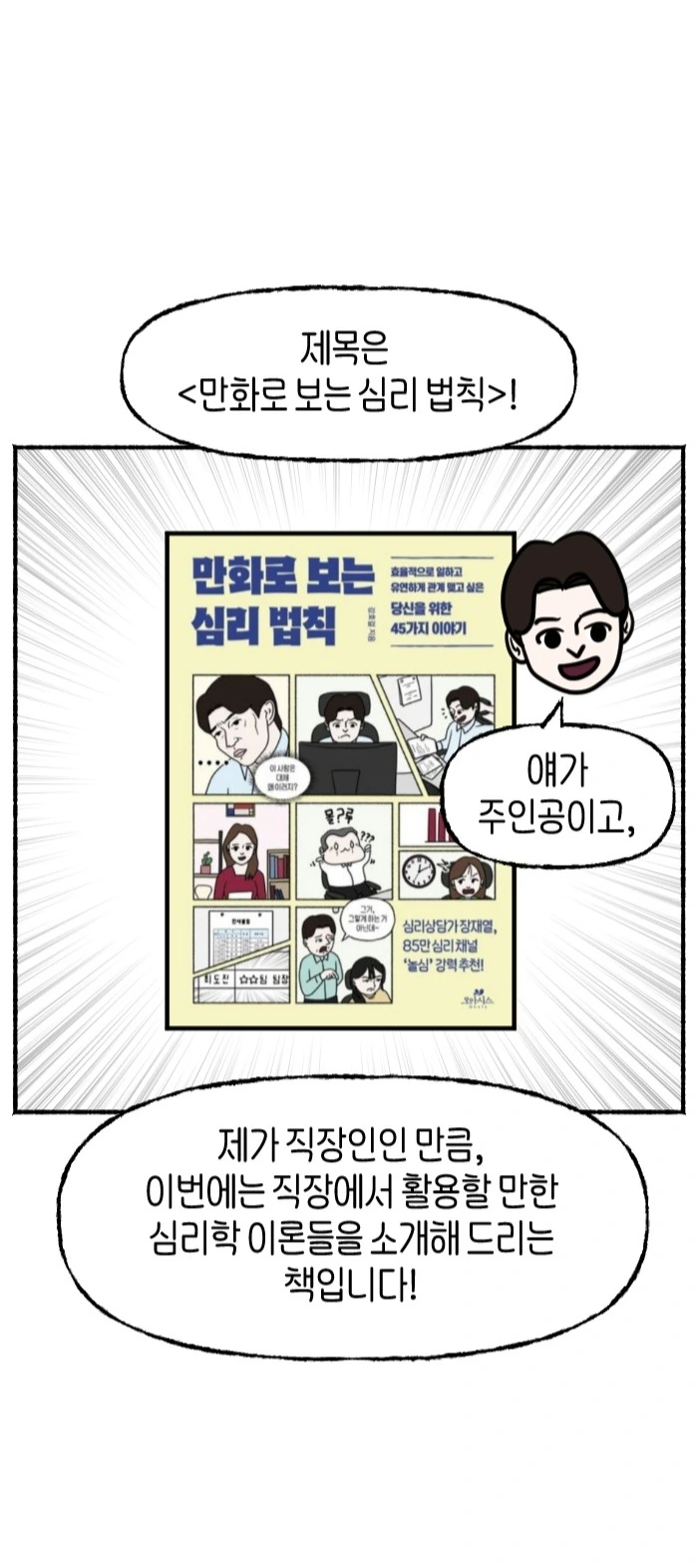 작가가 직접 그린 유쾌한 만화를 통해 45가지 심리 법칙을 쉽고 재미있게 들려주는 심리교양서다. 풍부한 연구 사례, 누구나 공감할 만한 에피소드, 일상에서 써먹을 수 있는 유용한 심리 법칙