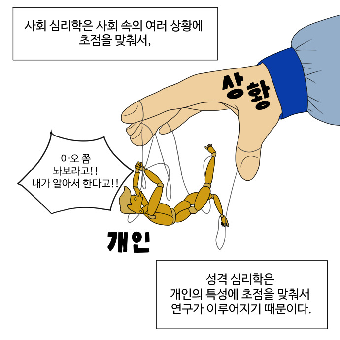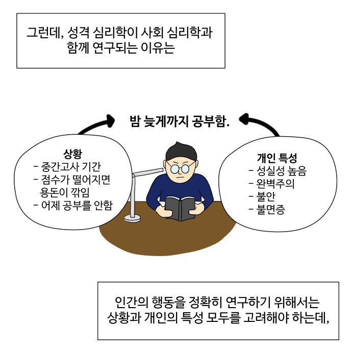 사회 심리학은 개인에게 미치는 상황의 힘을, 성격 심리학은 개인이 갖는 성격 특성에 초점을 맞춰서 각각 연구가 이루어집니다. 하지만 모든 것이 그렇듯, 어느 한 가지 측면으로 모든 것을 설명할 수는 없고, 이는 심리학 연구에서도 마찬가지 입니다. 사람의 행동을 설명하는 데 있어서 상황의 힘도 중요하지만, 개인의 성격 특성도 중요하고, 나아가 두 가지 요인들의 상호작용이 중요하게 작용하기도 합니다.