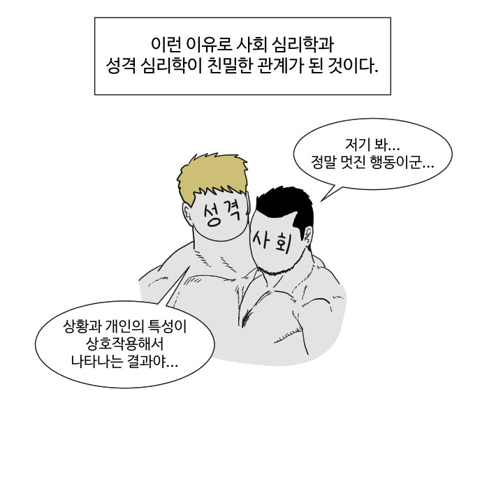 그래서 요즘의 대부분의 사회 심리학과 성격 심리학 연구들은 성격 변인과, 상황 변인 두 가지의 상호작용에 주목하는 경우가 많은데요, 해당 내용은 다음 화에서 더 자세히 살펴보도록 하겠습니다!