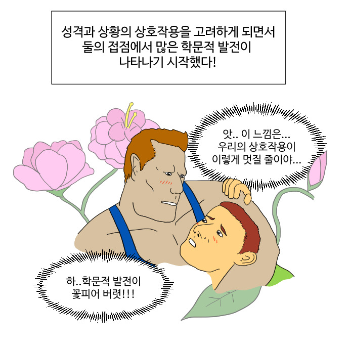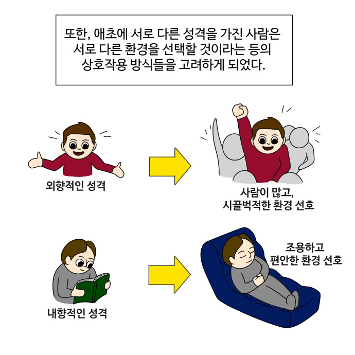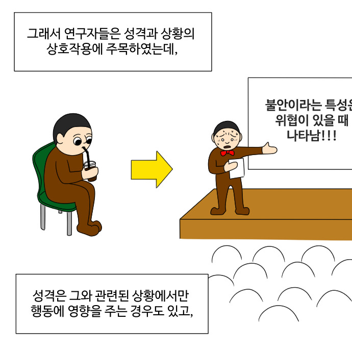 그래서 그들은 상황과 성격의 상호작용에 주목하게 되었고, 인간 행동을 예측하는 데 이를 중요한 고려사항으로 삼기 시작했습니다. 성격이 상황을 변화시킬 수도, 상황이 성격을 변화시킬 수도, 그리고 성격에 맞는 상황을 찾아가기도 하는 등의 상호작용 방식들이 제시되었습니다.
