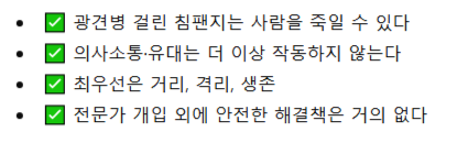 결론은 명확했다. 최대한 버틸 수는 있지만 살아남을 수 있는 방법은 희소하다는 것. 광견병 걸린 침팬지는 의사소통이 통하지 않을뿐더러 사람을 죽일 수 있는 위험한 존재다. 개인이나 집단이 직접 제압하거나 통제하려는 시도는 대부분 실패하고, 오히려 치명적인 결과를 부를 가능성이 크다. 그래서 유일하게 현실적인 선택은 전문가의 도움을 받는 방법뿐이다. 그전까지 인간이 할 수 있는 것은 접촉을 완전히 차단하고 거리를 유지하며 생존하는 수밖에 없다고 말했다. 다만, 물속으로 들어가거나 제압하는 선택은 생존 확률을 낮춘다고 덧붙였다.