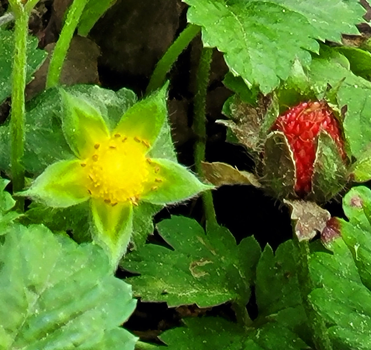 뱀이 먹는다는 뱀딸기입니다. 땅바닥에서 퍼지며 자랍니다. 독이 있어 먹으면 안 된다는 속설이 있습니다. 뱀에게 물리는 걸 조심하라는 뜻이 담겼습니다.