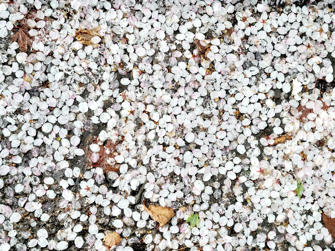 밤사이 내린 비로 벚꽃이 땅으로 떨어졌습니다. 나무에서 피었던 꽃들이 이제는 회색 바닥을 하얗게 덮었습니다. 떨어진 꽃잎들은 마치 작은 눈송이 같습니다. 사람들이 올려다보던 꽃이 이제는 발밑에서 또 다른 꽃을 피웠습니다.