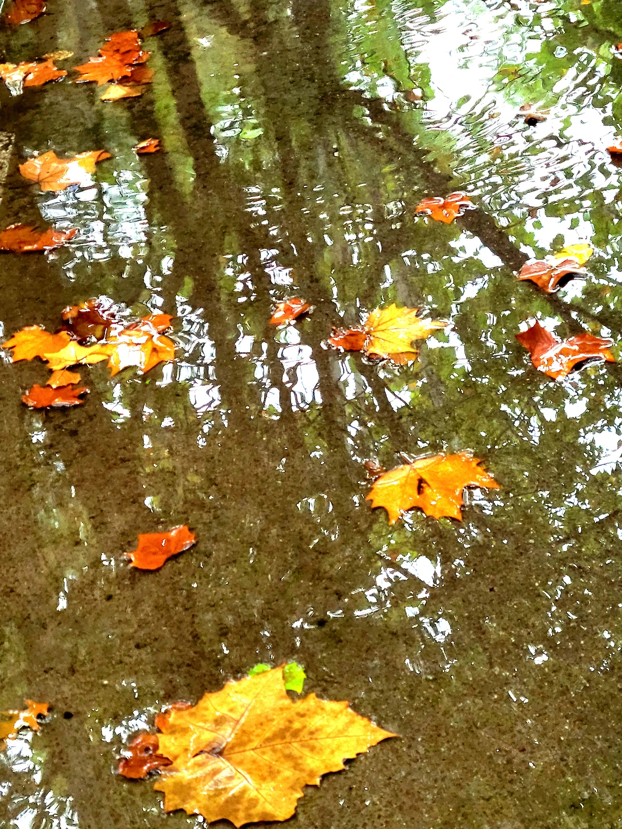 비 온 뒤 떨어진 나뭇잎, 그 위로 가을이 차분히 깃들었습니다.