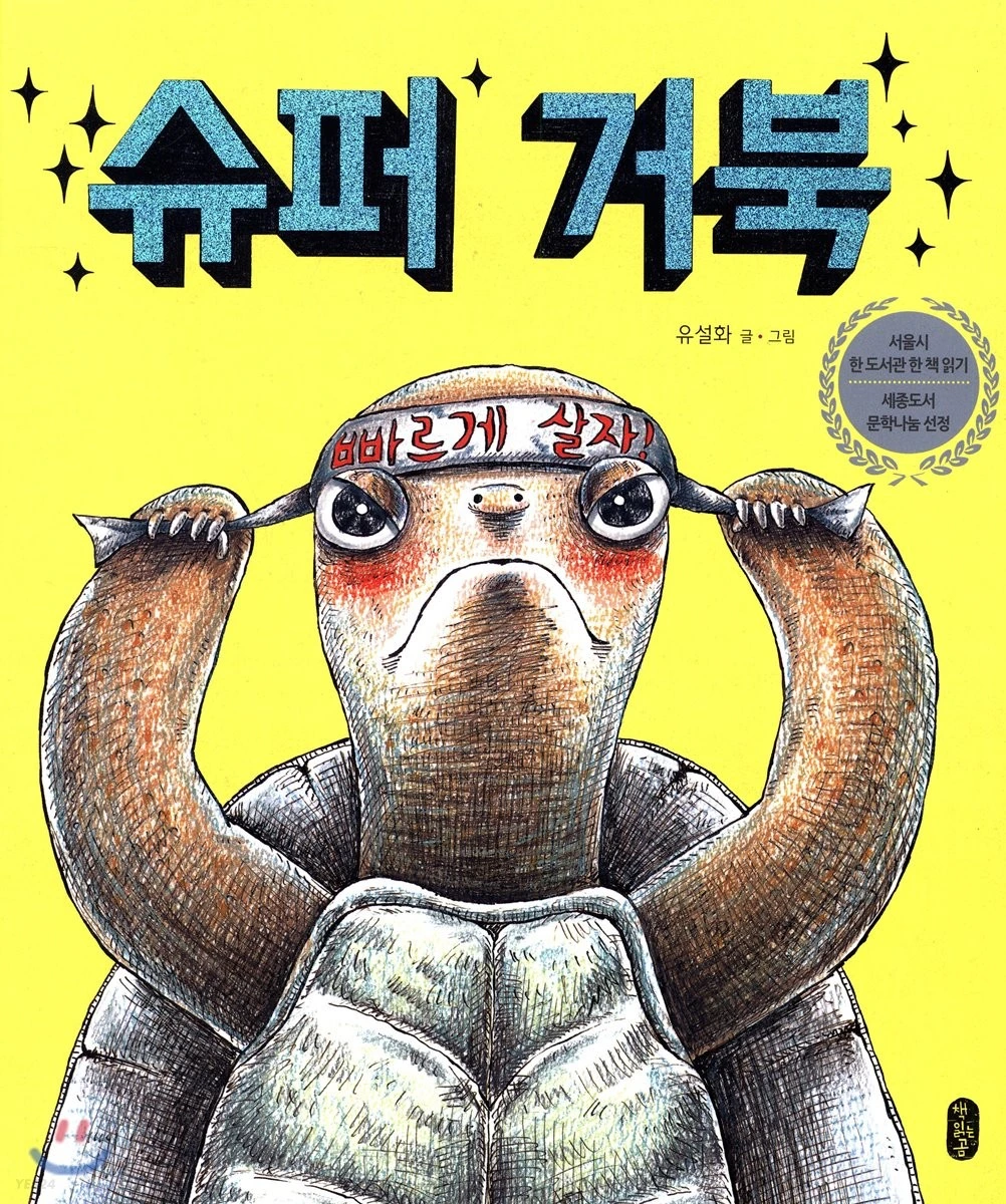 그림책 <슈퍼 거북>은 바로 <토끼와 거북이> 이야기의 후속편쯤 됩니다. 경주에서 이긴 거북의 삶의 변화와 우여곡절을 따라가며 비춥니다. 그 후 거북이는 행복했을까요, 불행했을까요?