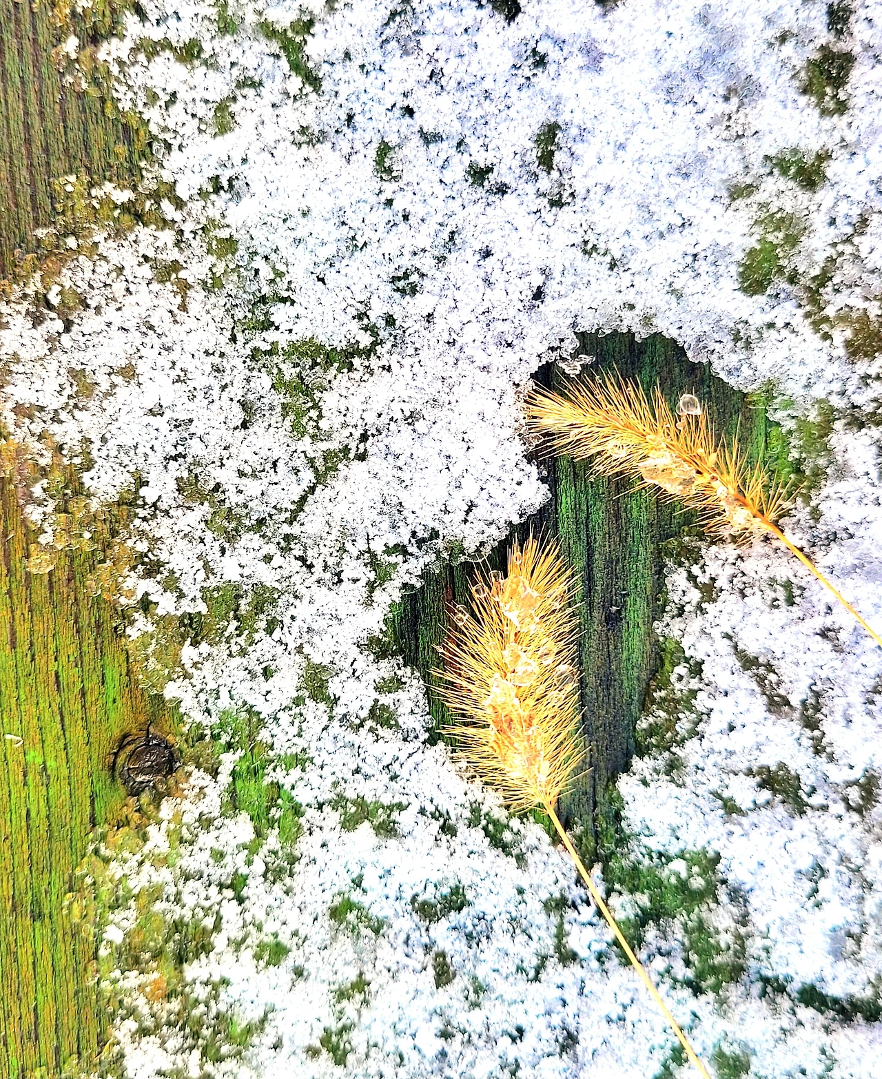 지난밤 내린 잔설이 강아지풀을 감싸고 있습니다. 하얀 눈에 안긴 강아지풀은 마치 그 안에서 잠든 듯합니다. 계절의 품에 몸을 맡긴 모습입니다. 겨울이기에 허락된 장면일 테죠.