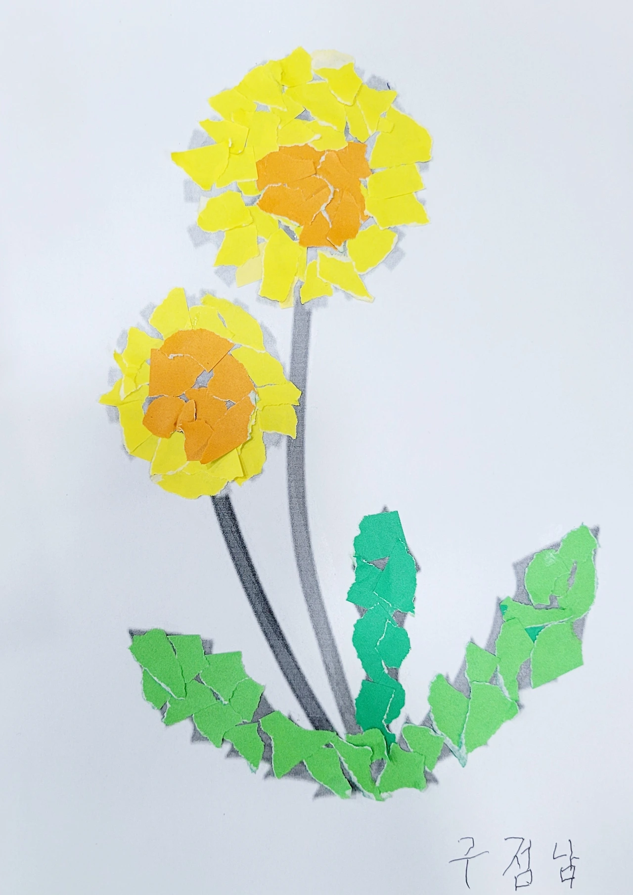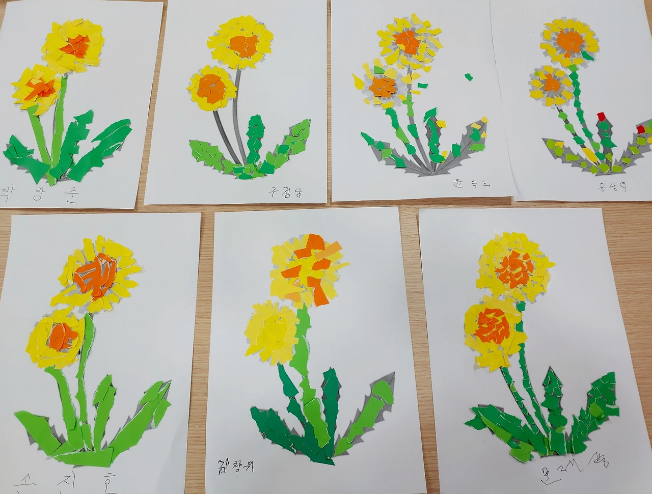 그림책 읽기를 마치고 민들레 바탕 그림에 색종이를 찢어 붙이는 활동을 했습니다. 잘게 부서진 강아지똥이 고운 민들레꽃을 피우는 장면을 떠올리면서 손작업을 해보자고 제안했지요. 손가락을 움직이는 활동은 뇌를 자극하여 인지능력을 강화시켜 준다는 점을 착안한 활동입니다.
