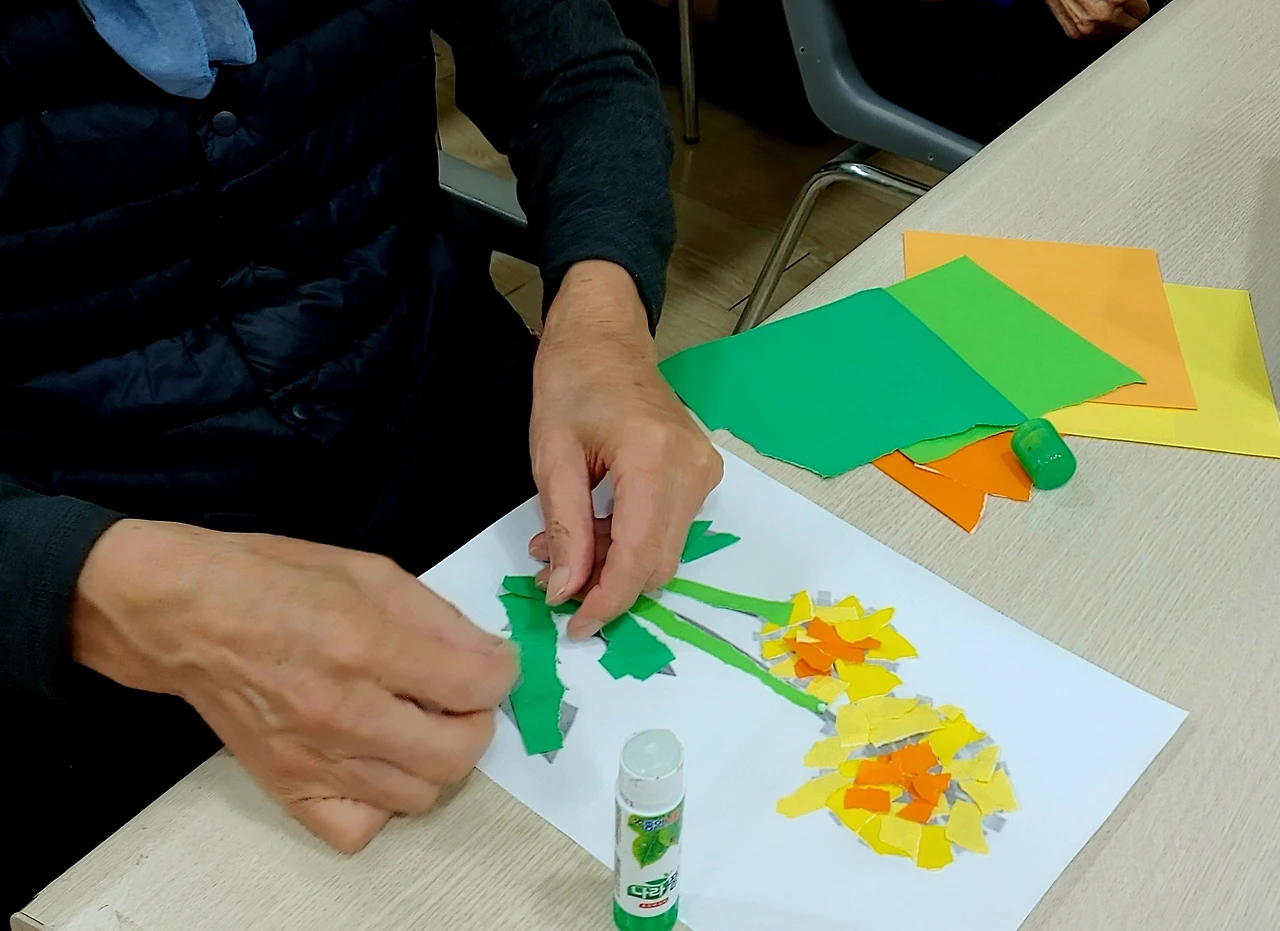민들레 그림 위에 노랑과 연두, 초록의 색종이 조각을 붙여 나갔습니다. 색종이 찢는 걸 옆에서 도우면서 어르신들의 표정을 보니 진지하면서도 즐거워 보였습니다. 그림책의 내용과 관련된 이 활동이 잘 어울린다는 생각에 안심이 되었습니다.