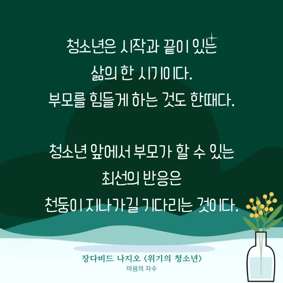 즉, 훌쩍 성장해버린 자녀의 유년기와 이별해야하고, 생각이 건전하고 별 문제 없이 가족과 가족의 가치관을 존중하는 이상적인 청소년에 대한 환상도 떠나보내야 한다.