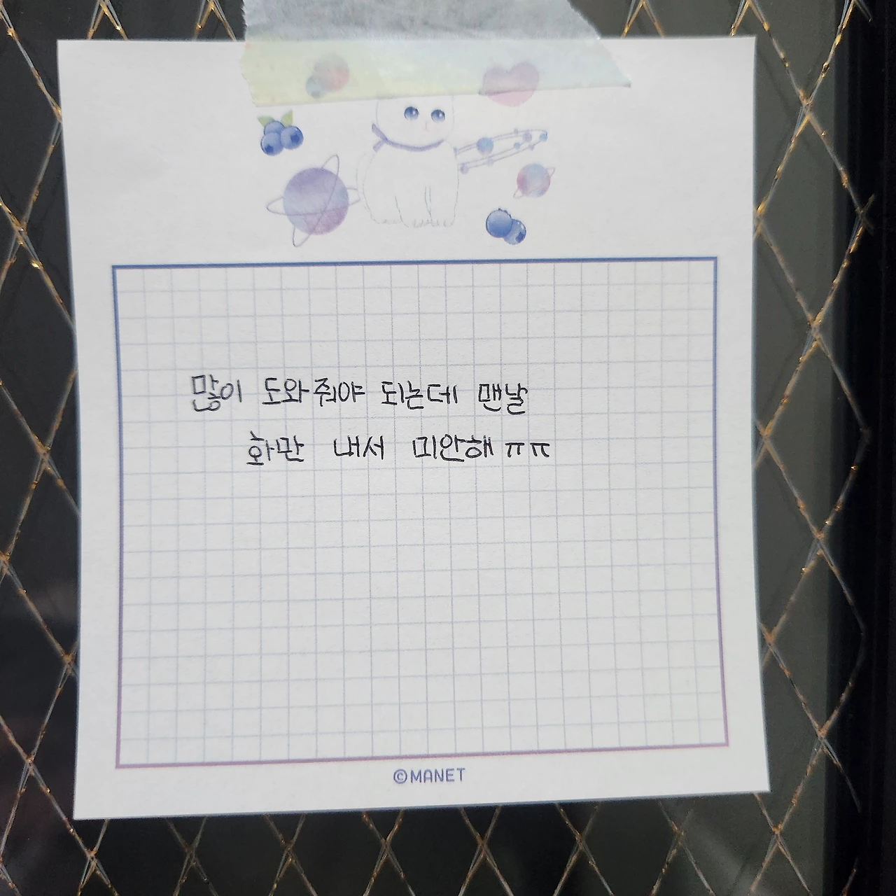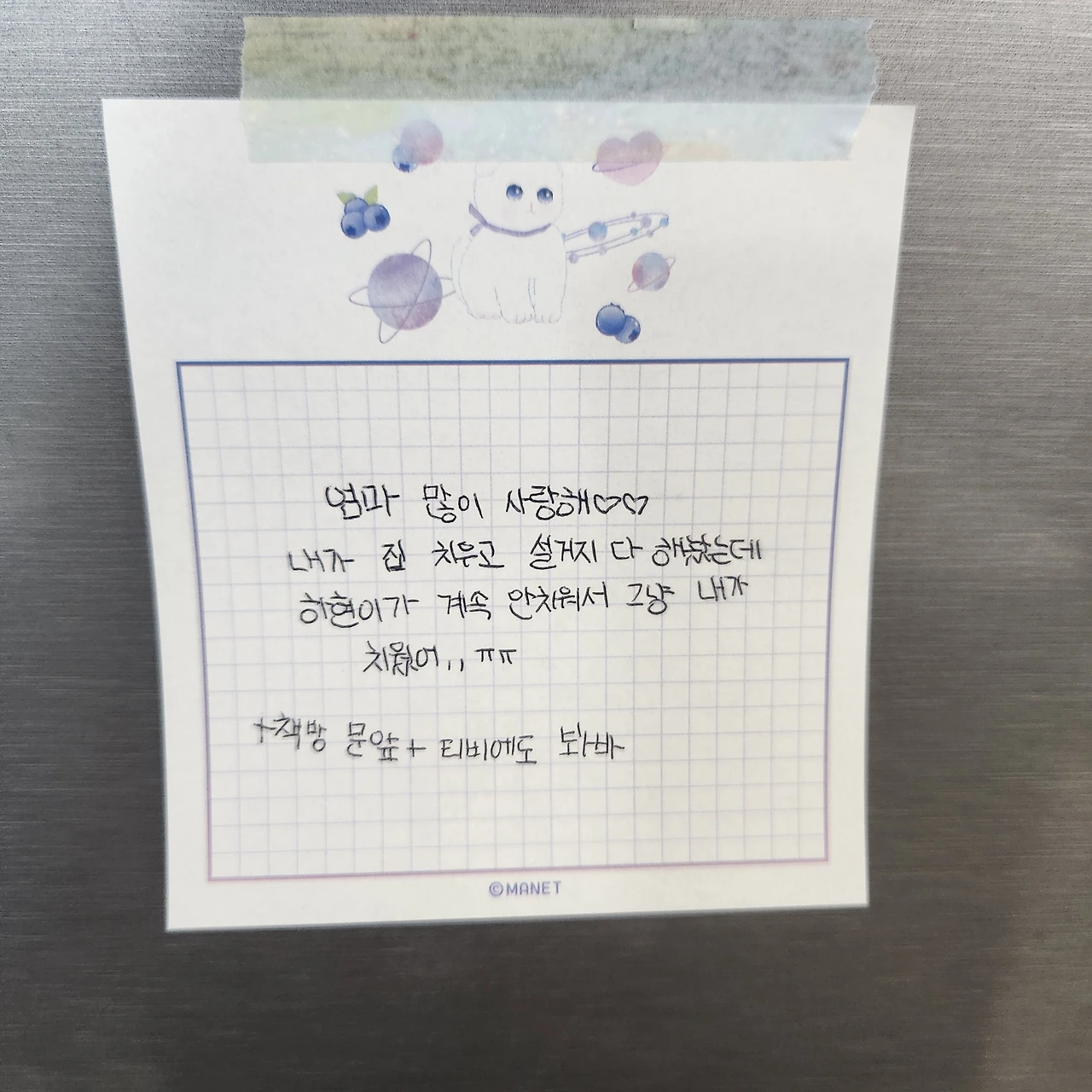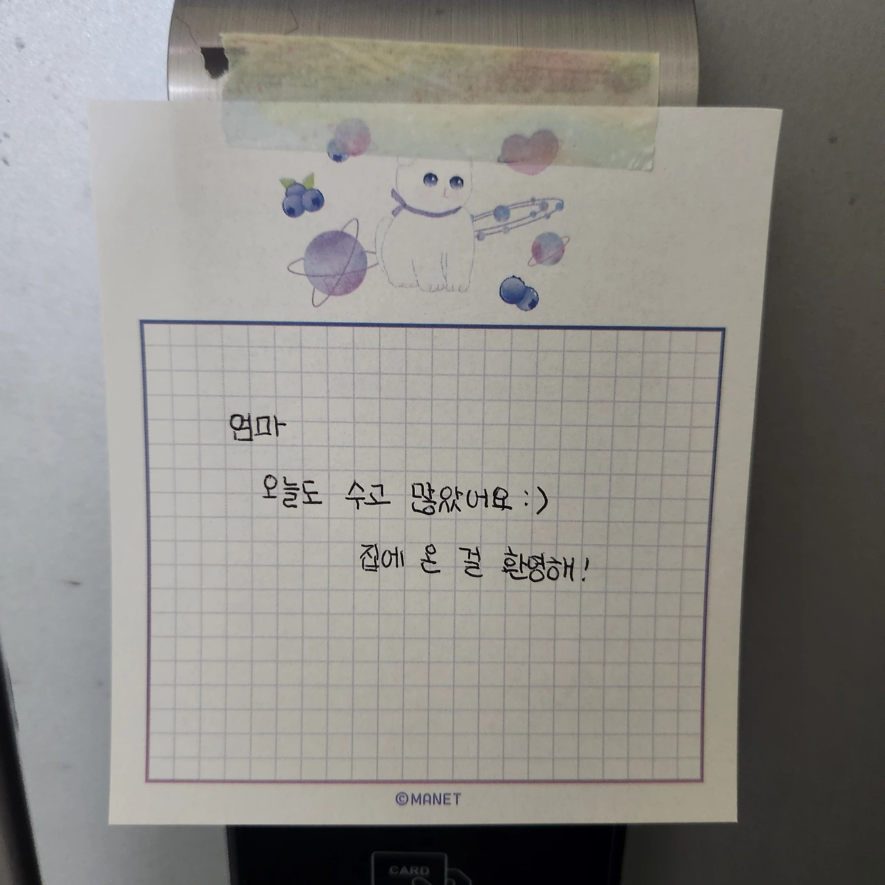 집에 온 걸 환영한다는 아이의 인사말에 버글거렸던 걱정이 눈 녹듯 사그라졌다. 작고 귀여운 포스트잇에 적힌 아이의 곰살맞은 쪽지를 떼어 들고 현관문을 열었다.