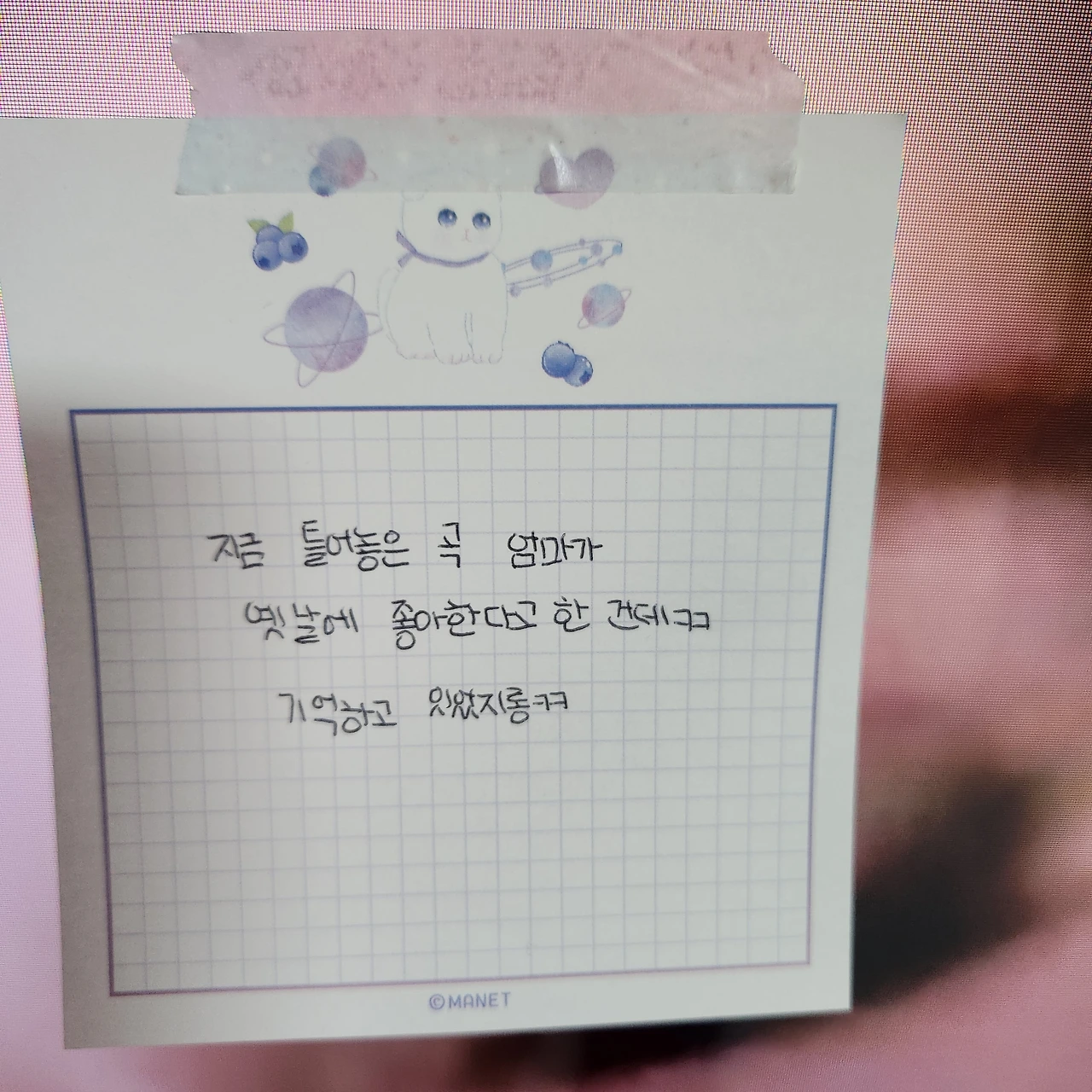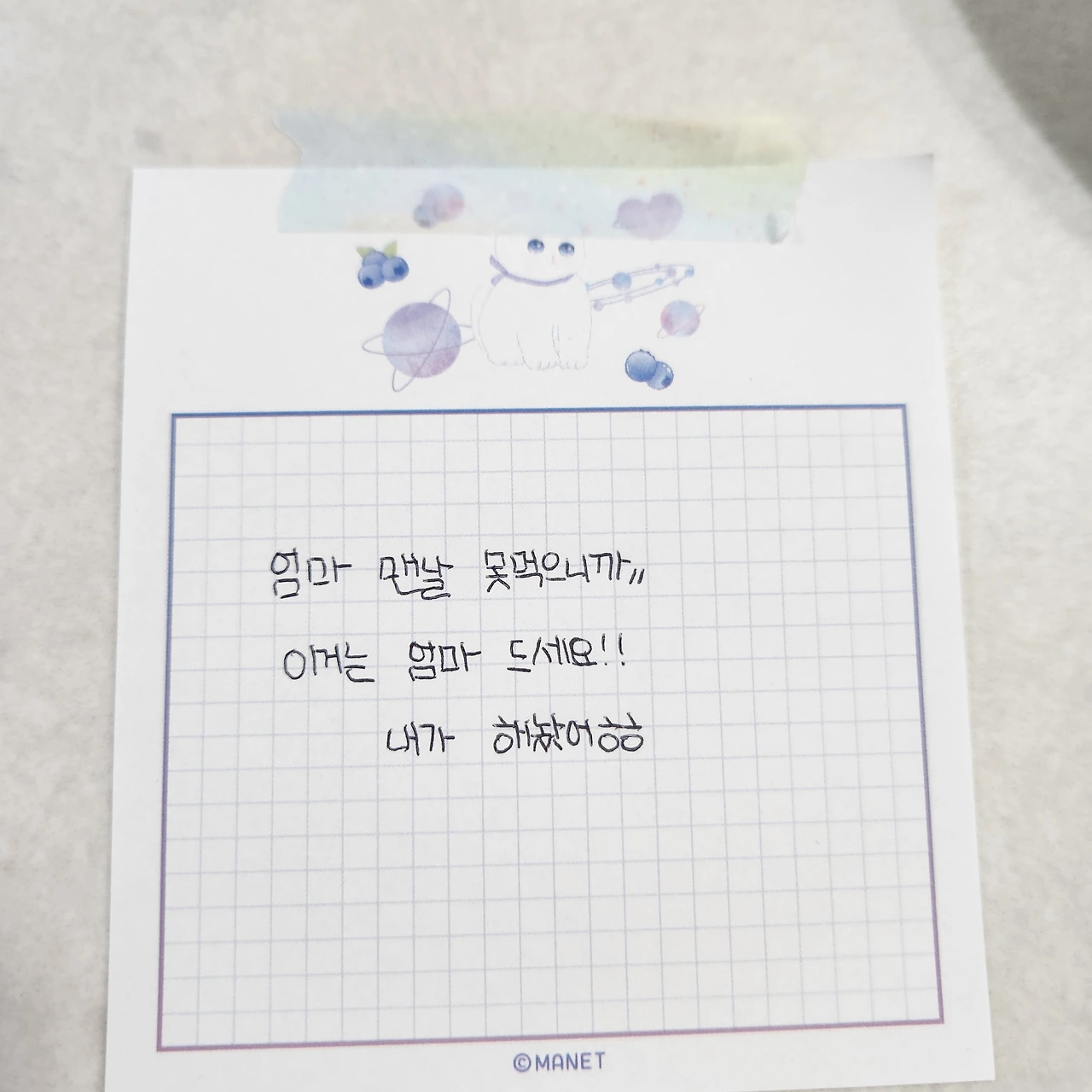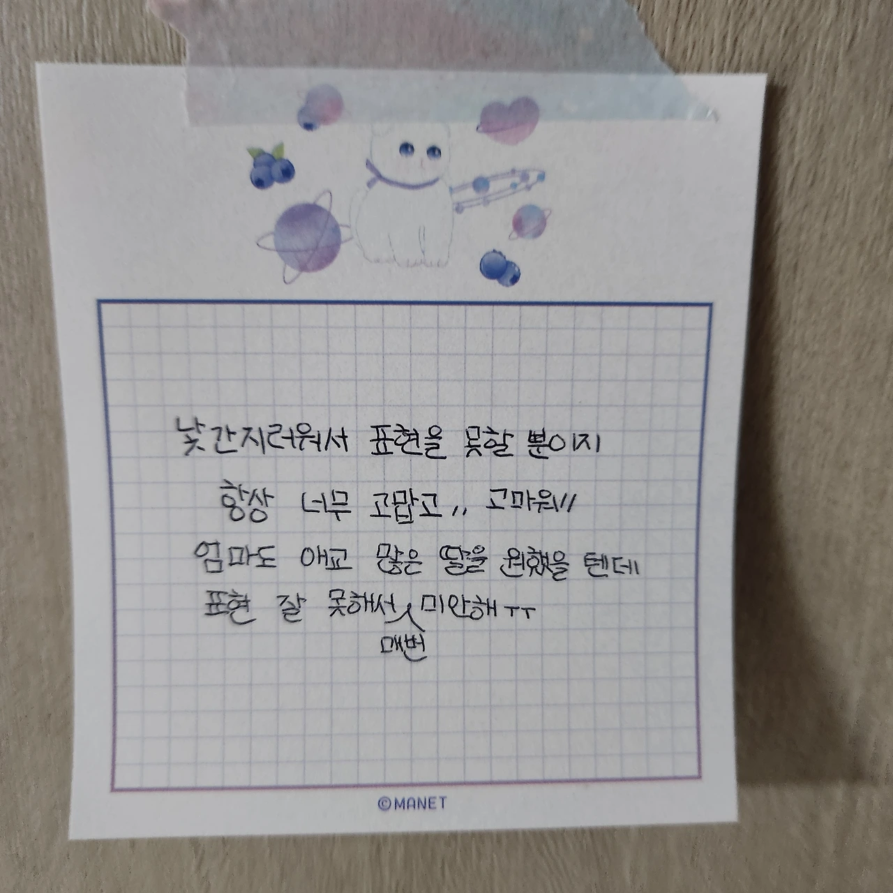 집에 온 걸 환영한다는 아이의 인사말에 버글거렸던 걱정이 눈 녹듯 사그라졌다. 작고 귀여운 포스트잇에 적힌 아이의 곰살맞은 쪽지를 떼어 들고 현관문을 열었다.