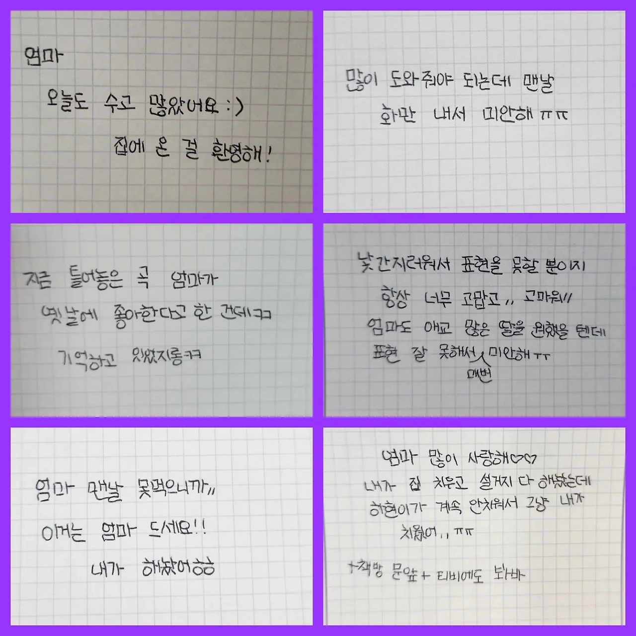 "낯간지러워서 표현을 못할 뿐이지 항상 너무 고맙고.. 고마워!! 엄마도 애교 많은 딸을 원했을 텐데 표현 잘 못해서 매번 미안해"