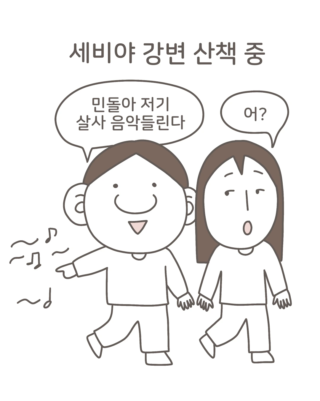스페인 세비야 길에서 만난 살사는 흐르는 강변 옆 저녁 붉은 노을을 배경의 여유로운 모습이었다.