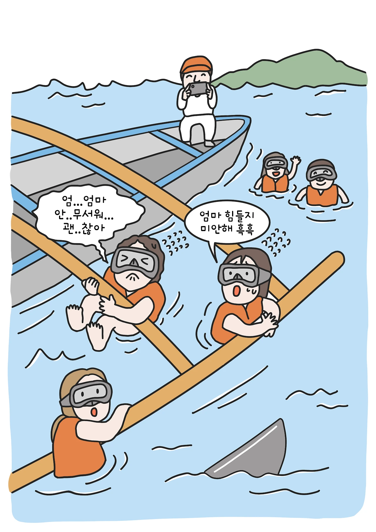다행히 고래가 잠시 등을 물 밖으로 내밀었을 때, 엄마는 나무에 매달려 덜덜 떨면서도 어린아이처럼 기뻐했다. 짧은 순간이었지만 그나마 고래상어를 볼 수 있어서 다행이었다.