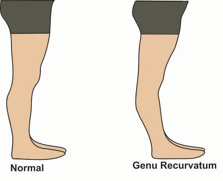 왼쪽: 무릎의 과신전 형태. O다리일수도 있고 X다리일수도 있다.
