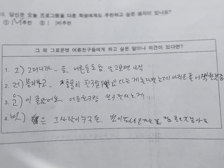 나 정말 아무것도 아닌 사람인 줄 알고 살아왔는데 아이들은 나를 너무도 특별하게 바라봐준다. 그럴 때마다 부끄럽지만 세상을 다 가진 기분이 들기도 한다. 오늘 우리 친구들은 어떤 하루를 보냈을까? 다음에 만나면 더 많이 사랑해야지.