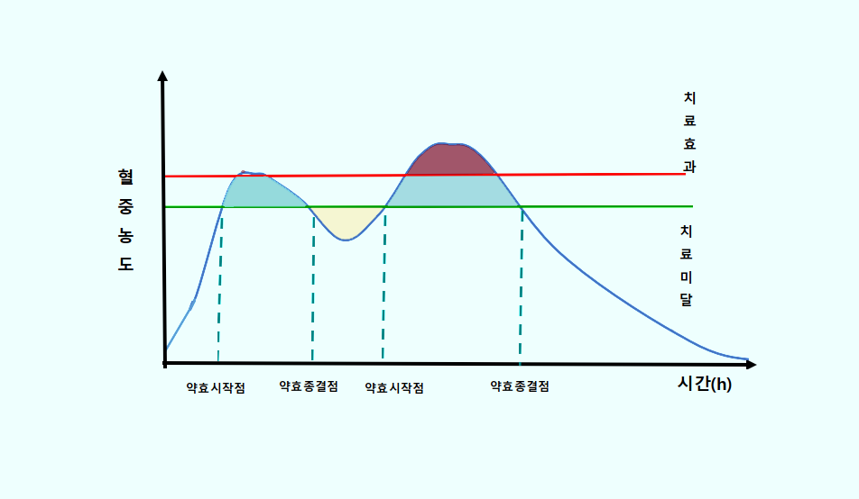 효과가 나타나는 혈중 농도를 나타내는 초록선과 파란색의 약물 농도 곡선과 만나는 지점을 보면 효과가 늦게 시작하고 일찍 종료됨을 볼 수 있습니다.