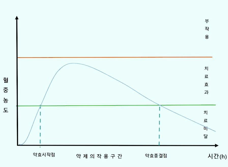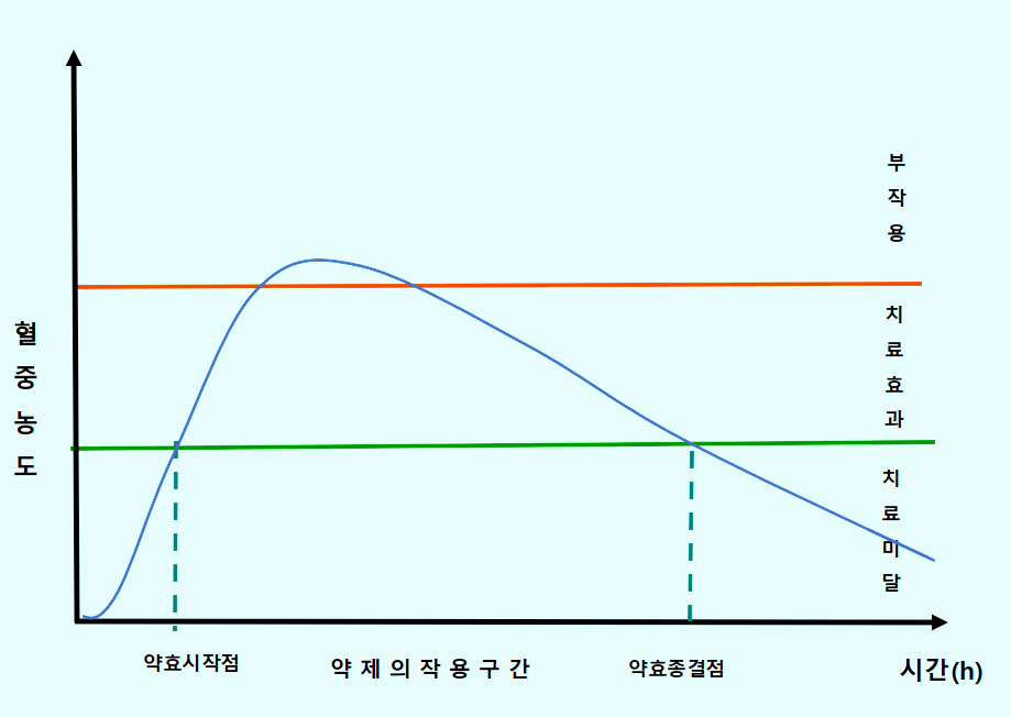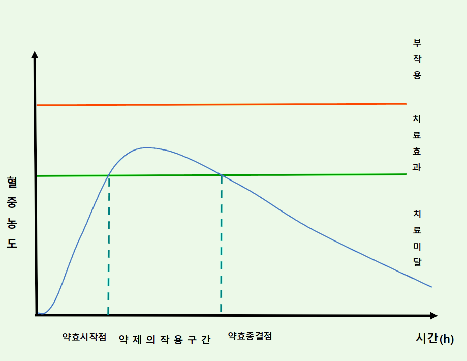 파란색의 약물의 농도 곡선이 초록색의 효과 선과 만나는 지점이 약효가 지속되는 구간입니다.