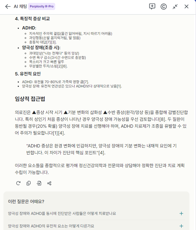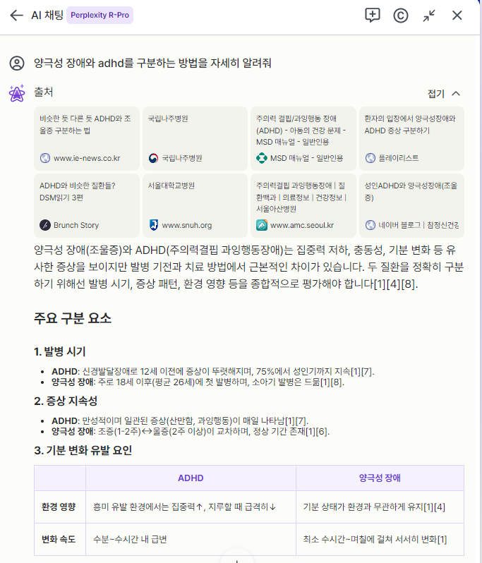 실 예로, 양극성 장애(조울병) 와 ADHD를 어떻게 구분하는지를 물었더니 다음과 같습니다.