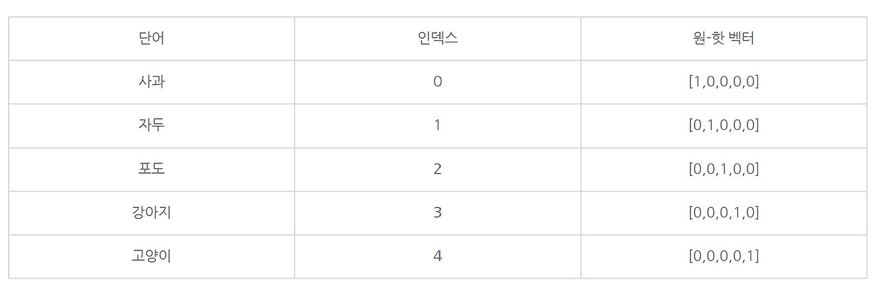 텍스트, 즉 인간의 언어를 숫자 벡터로 표현하는 방법에는 여러 가지가 있습니다. 가장 간단한 방법은 주어진 텍스트에 포함된 단어의 개수를 세어서 숫자 벡터의 차원을 정의하고, 각 단어에 번호를 붙여 숫자 벡터를 표현하는 것입니다. 예를 들어, "사과 자두 포도 강아지 고양이"이라는 텍스트는 사과, 자두, 포도, 강아지, 고양이라는 5개의 단어로 구성되어 있으니 숫자 벡터는 5차원이 되고, 각 단어마다 인덱스를 0, 1, 2, 3, 4로 지정한 뒤 해당 단어의 인덱스에 1을, 나머지 인덱스에는 0을 넣어서 아래 표와 같이 5차원의 숫자 벡터 5개로 표현할 수 있습니다. 이러한 숫자 벡터를 원-핫 벡터라고도 부릅니다.