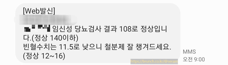 둘째 아이 임당검사 정상 문자 안내“임신성 당뇨검사 결과 108로 정상입니다.(정상 140 이하) 빈혈수치는 11.5로 낮으니 철분제 잘 챙겨드세요.(정상 12~16)”