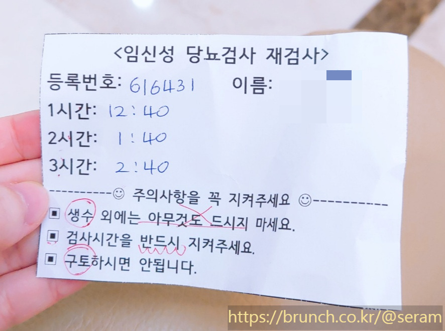 첫째 아이 임당검사 재검사 안내8시간 이상의 금식, 재검사 소요시간은 3시간이었다. 매시간 채혈했고, 네 번의 주사기가 내 팔을 찔러댔다. 스트레스는 더욱이 깊어졌다. 결국 임신성 당뇨 확정 통보를 받았다. 눈물이 났다. 아이에게 미안했다. 아이에게 위험한 엄마가 된 것 같아 힘들었다. 괴로운 마음이 아이에게 결코 도움이 될 수 없다는 것을 깨달았다. 확실한 상태를 파악하고 아이와 함께 건강하게 만나기를 바랐다. 나의 바람대로 아이는 자연분만에 적정 체중, 모두 정상으로 세상에 나와 튼튼한 대한의 남아로 잘 자라고 있다.