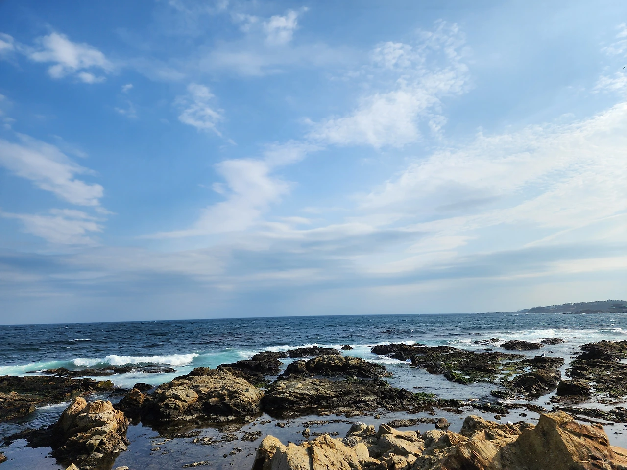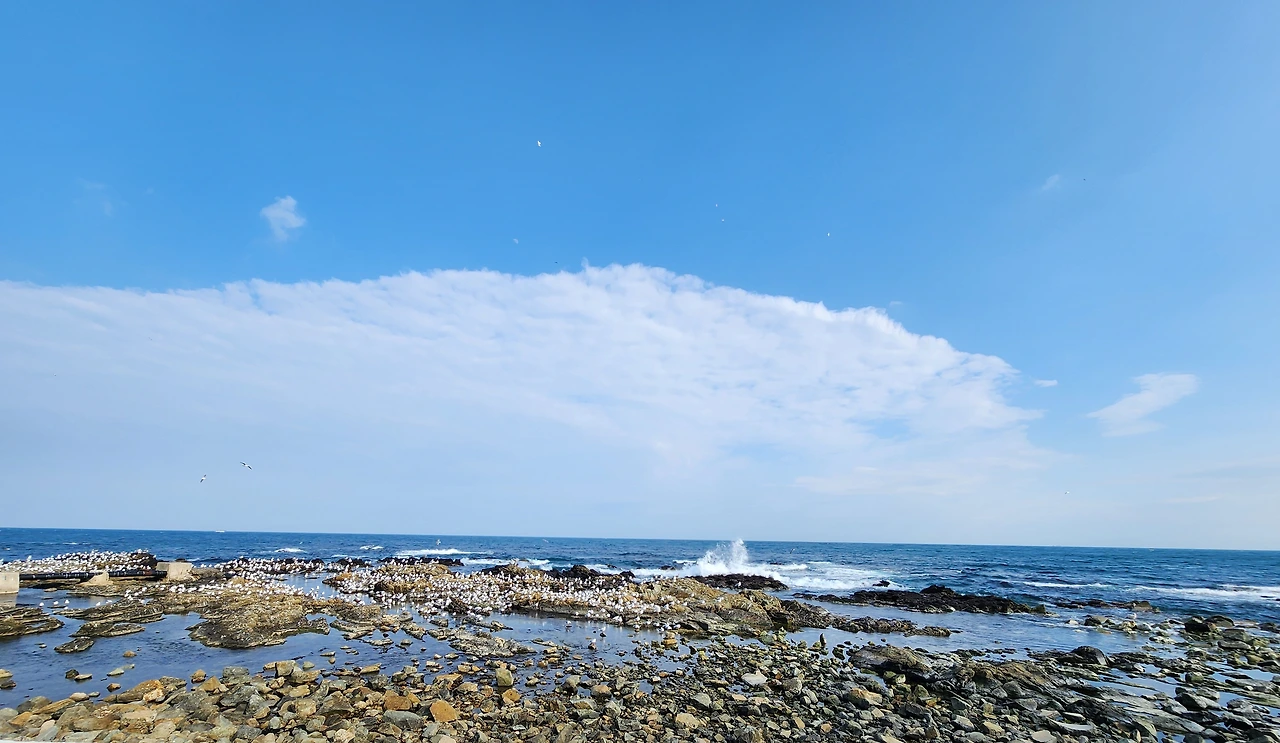 다시 앞자리로 돌아왔다. 숨을 한번 크게 쉬고 창문을 내려 사진을 찍었다. 나의 예술혼이 이 사진 한 장에 담겼나 보다. 좀. 잘 찍은 것 같다. 이 사진을 보고 있노라니 ‘바위섬’이 생각났다. 어릴 때부터 그 노래를 들으면 항상 눈물이 났다. 왜일까. ‘아무도 없는 바위섬’에 감정이입이 되었던 것 같기도 하다. 그런데 웬걸. 이 사진을 보면서 ‘바위섬’ 노래가 떠올랐지만 그다지 슬프게 느껴지지는 않았다. 바위와 파도, 하늘, 구름 등이 따로가 아니라 하나같았다. 서로를 따뜻하고 포근하게 안아주는 듯했다. 그래서 자꾸만 이 사진을 멍하니 바라보게 되었다.