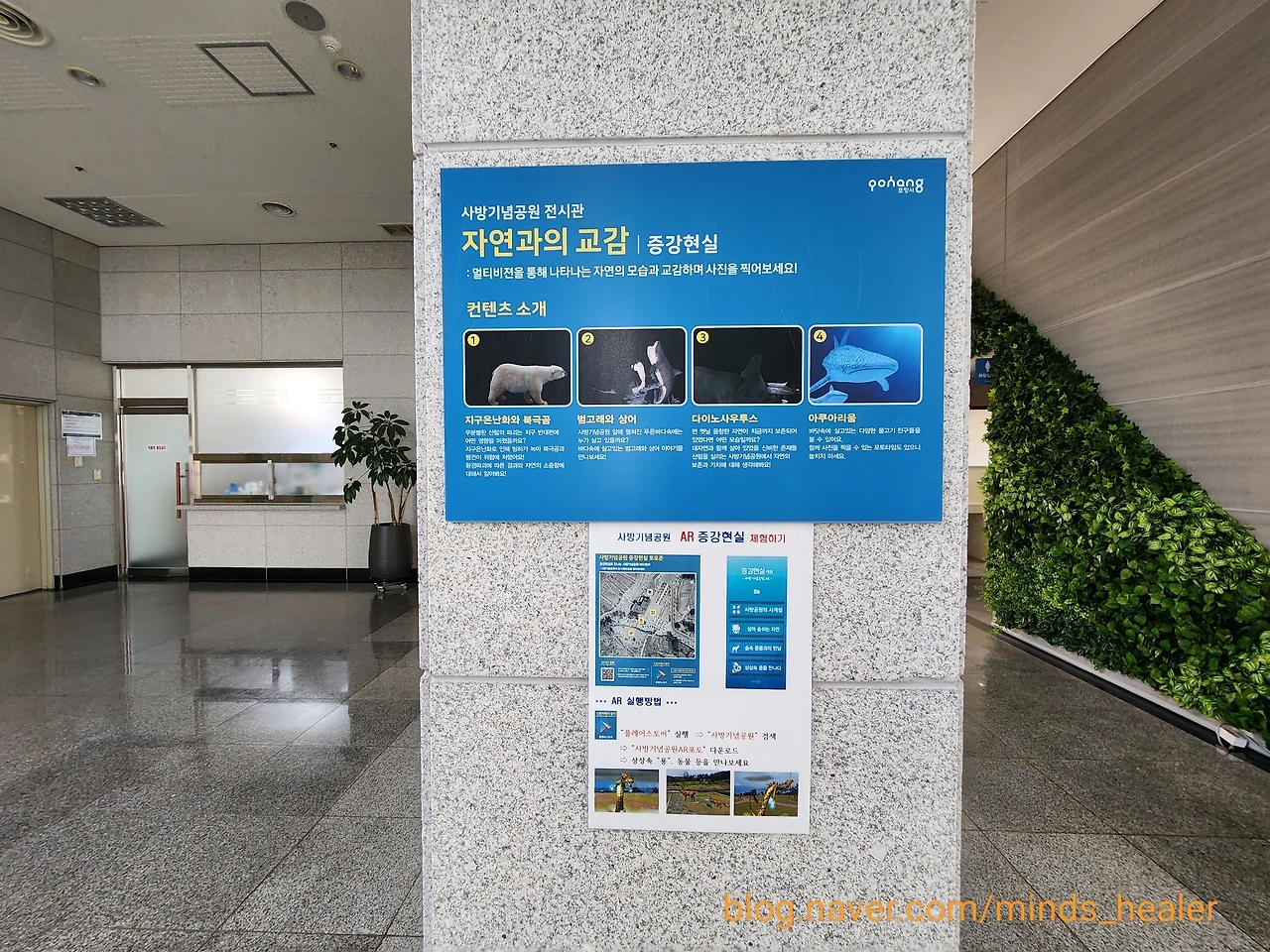 아까 사방기념공원 AR 증강현실 포토존을 알려드렸는데요. 전시관에도 자연과의 교감 증강현실이 있었어요. 지구온난화와 북극곰, 범고래와 상어, 다이노사우루스, 아쿠아리움을 만날 수 있다고 하니 관심 있으신 분들은 참여해 보셔요.
