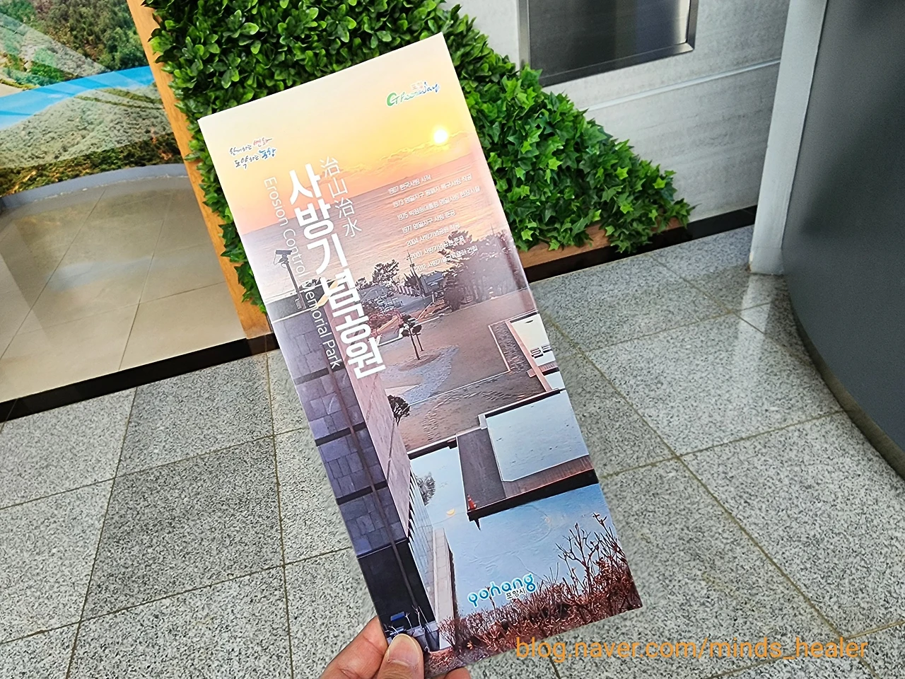 사방기념공원의 팸플릿입니다. 사방기념관 건물 뒤 높은 곳에서 바다를 향해 찍은 사진입니다. 해가 떠오르는 모습이 멋져 보여요.