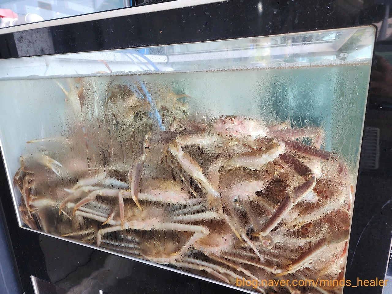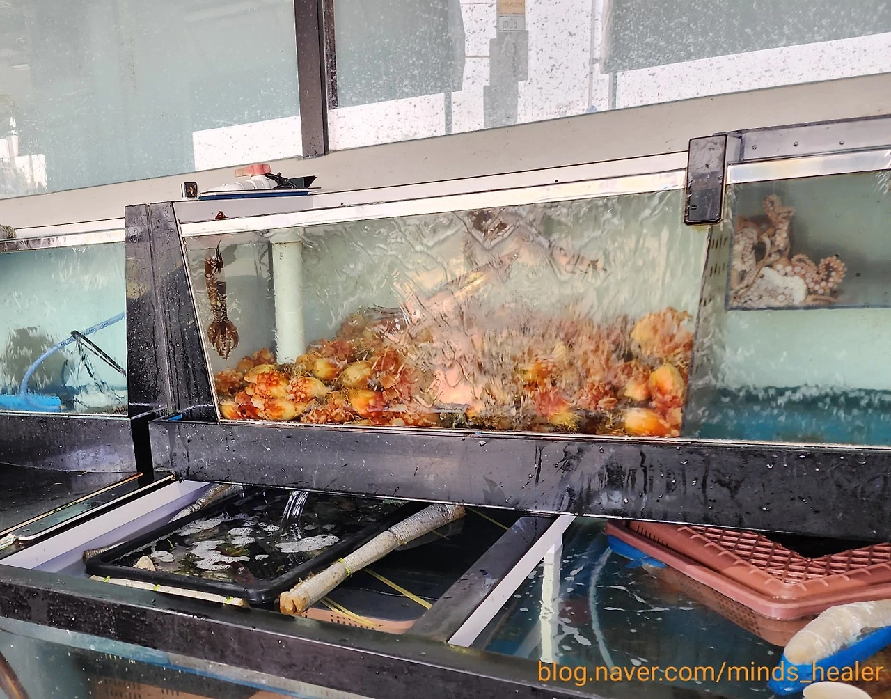 바다원해 입구를 들어가면 대게와 물고기, 해산물들이 많이 있어요.