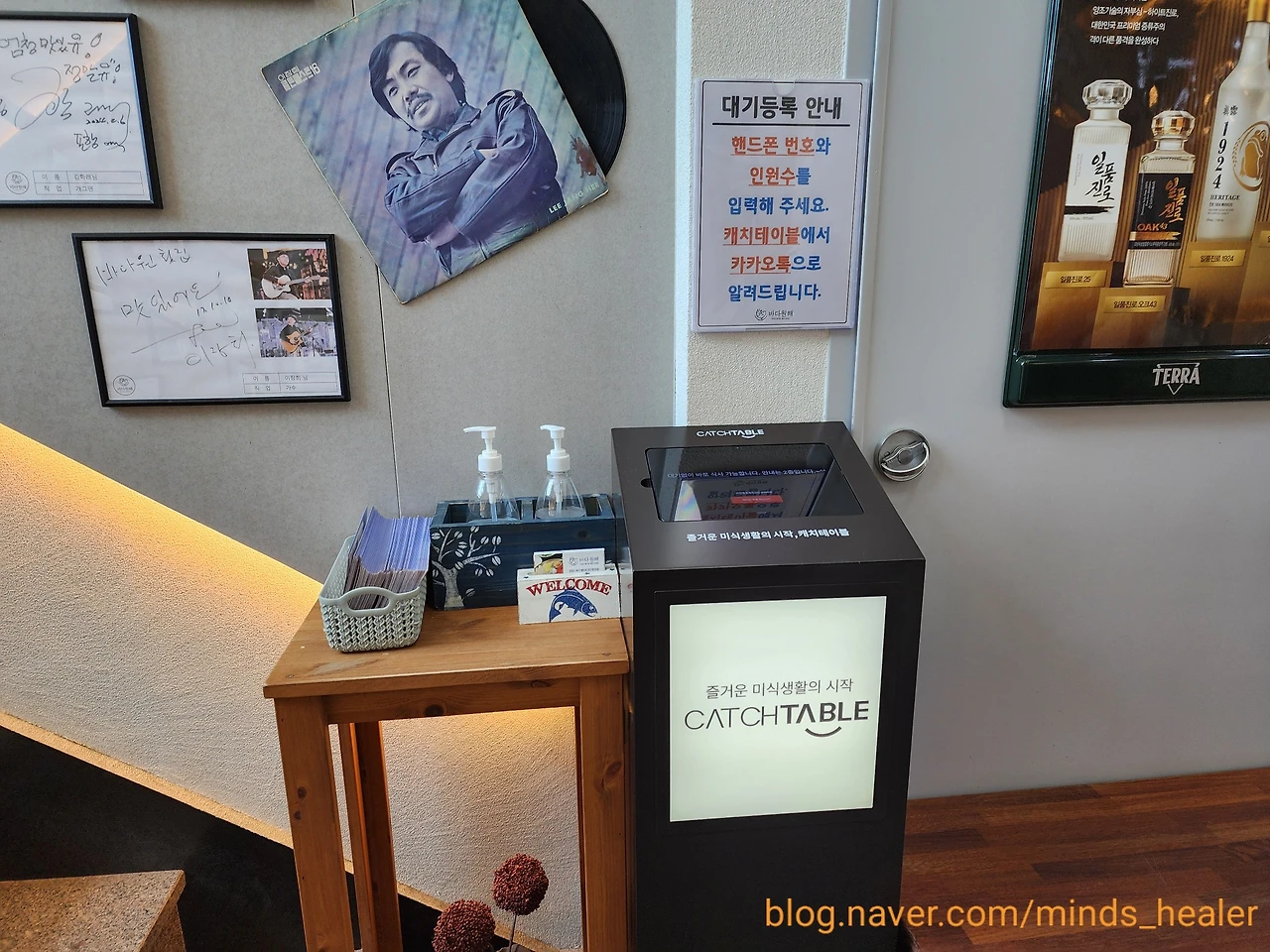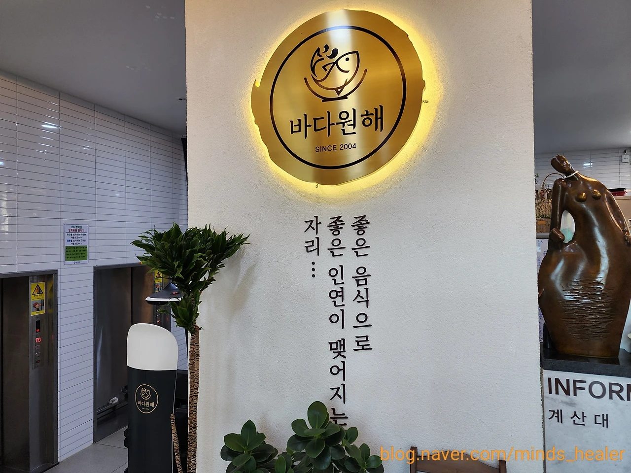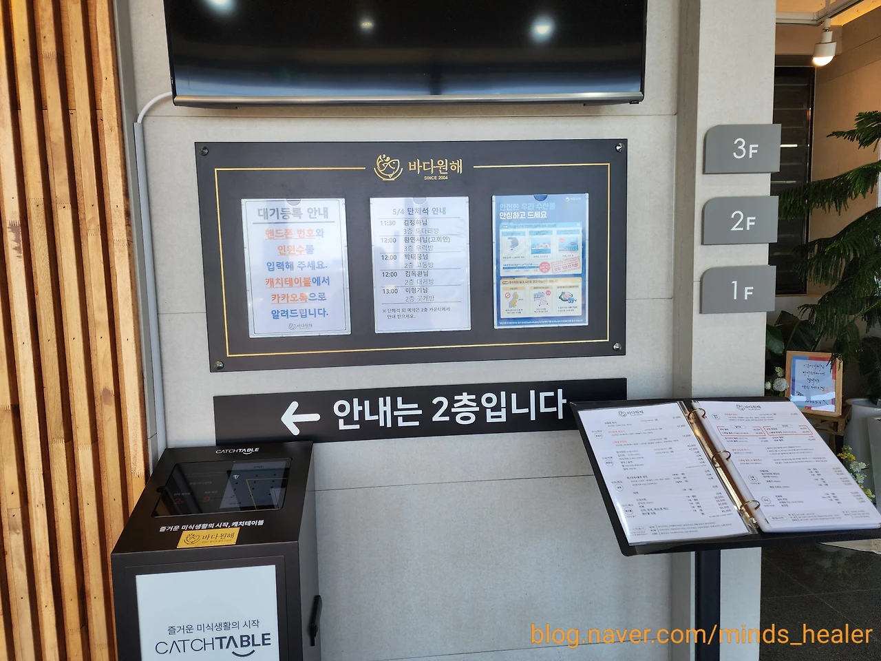 각종 물고기와 해산물을 지나 1층으로 들어서면 대기등록과 단체석 안내, 메뉴판이 준비되어 있어요. ‘안내는 2층’이라는 문구도 있었는데요. 2층이 메인 식당인데, 1층까지 메뉴판이 제공되어 있다는 것은 웨이팅도 있다는 것이겠죠? 그만큼 인기 있는 곳이랍니다^^