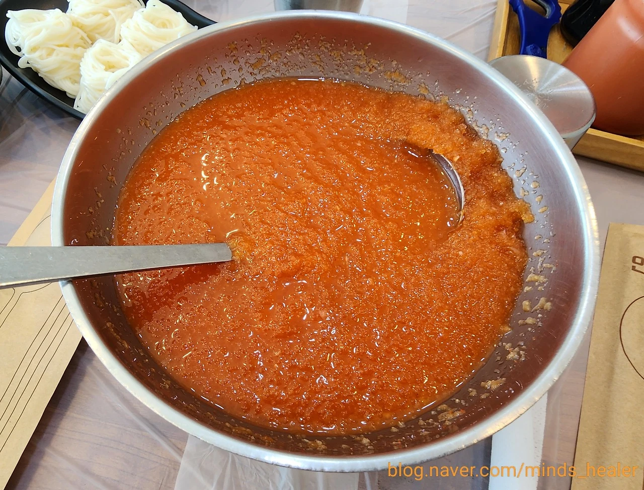 푸짐한 물회와 새콤달콤 살얼음 동동 육수입니다. 포항 전통 물회는 고추장만 넣고 물을 조금 섞어 먹는 것인데요. 개인적으로는 새콤달콤 육수를 넣은 물회를 좋아해요^^ 처음에는 물회만 살짝 먹다가 국수를 풀어서 먹고, 마지막에는 밥까지 말아먹으면~ 크~! 든든하니 깔끔한 맛이랍니다.
