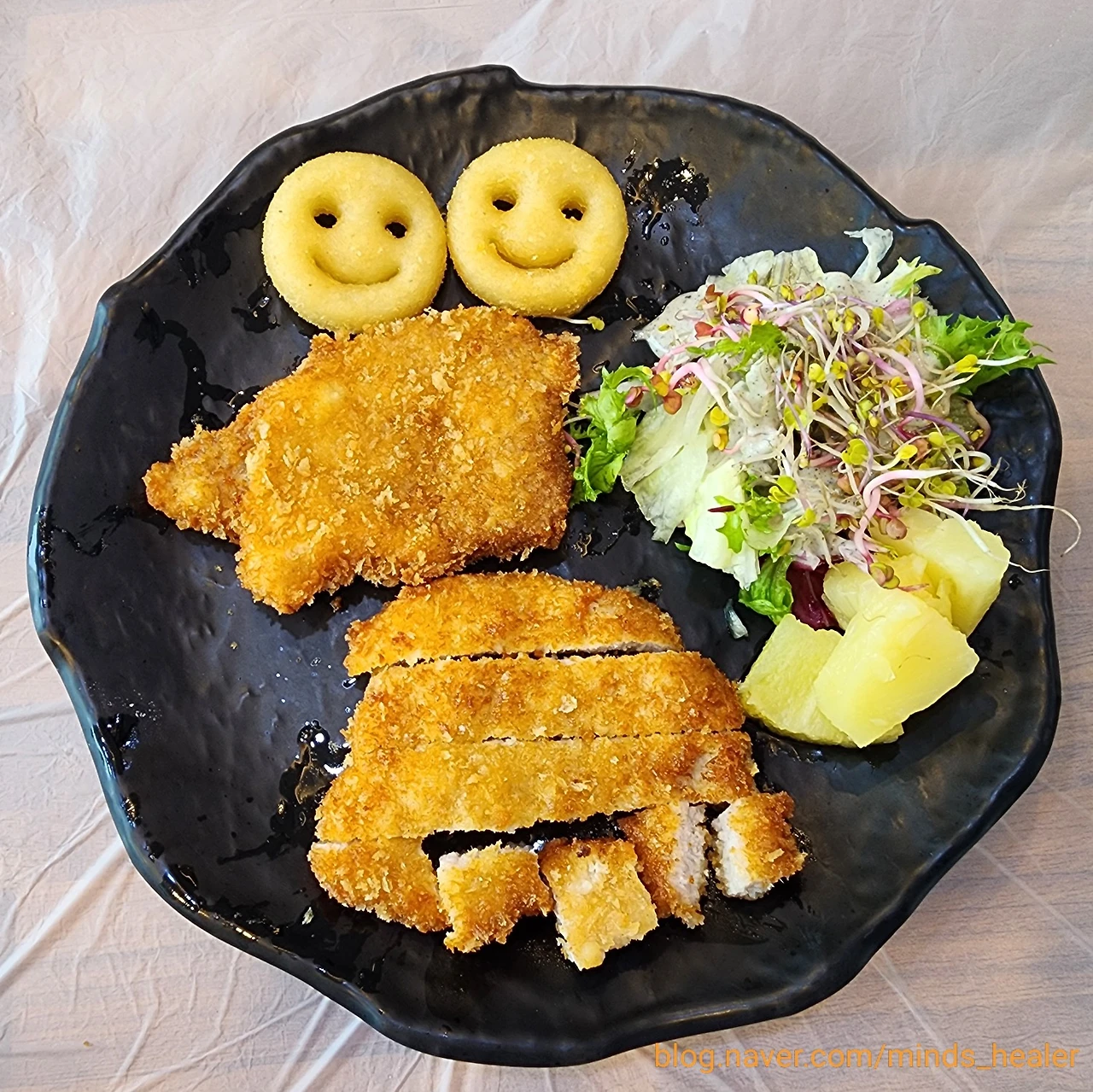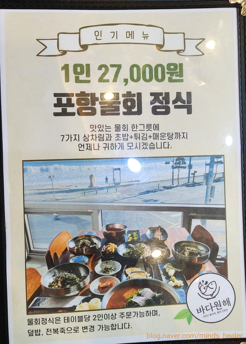 오늘은 자세한 메뉴판도 가져왔어요. 어제 다 같이 먹은 것이 ‘포항물회 정식’이었는데, 인기메뉴였습니다. 맛있는 물회 한 그릇에 7가지 상차림과 초밥, 튀김, 매운탕까지 먹을 수 있어요. 물회정식은 테이블당 2인이상 주문가능하고, 덮밥, 전복죽으로 변경할 수 있다고 합니다!