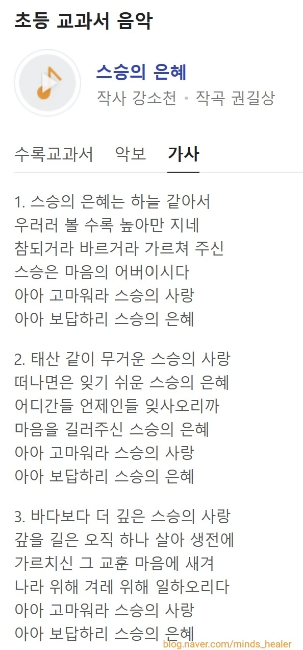 3절 : “바다보다 더 깊은 스승 사랑, 가르치신 그 교훈 마음에 새겨” 스승은 ‘바다보다 더 깊은 사랑을 주는 사람, 마음에 새길만한 교훈을 가르쳐 주는 사람’입니다.