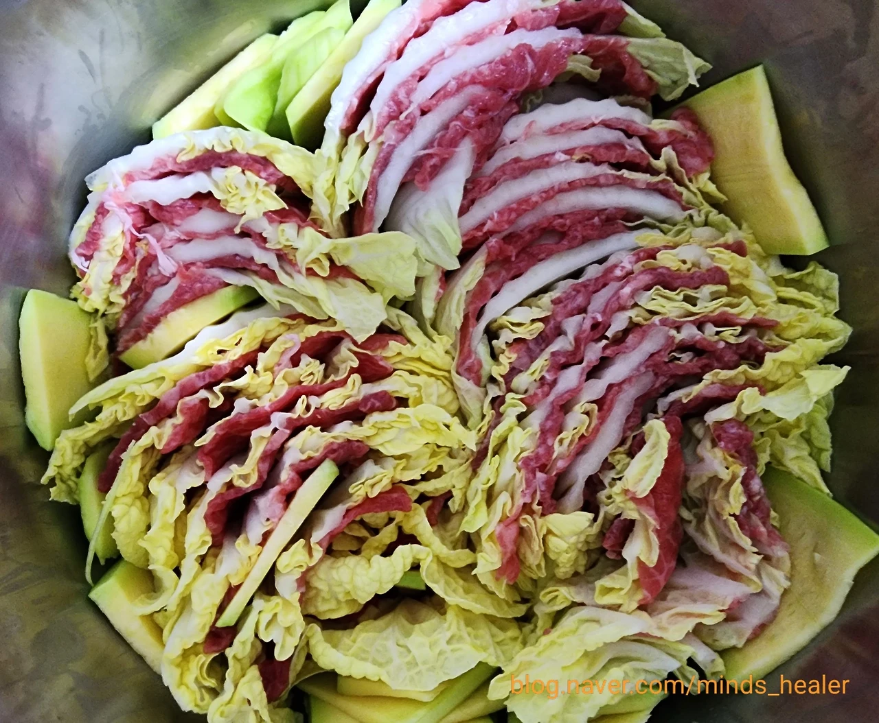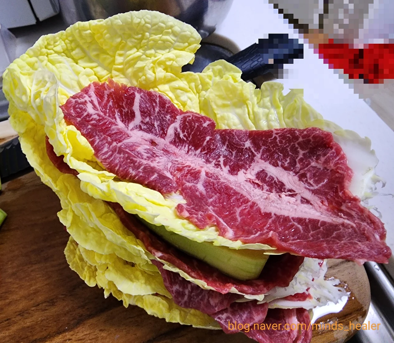 어떤 반찬을 하면 좋을까 하다가 얼마 전에 샤브샤브 육전용 부채살을 사둔 것이 떠올랐습니다. 그래서 간단하게 배추와 부채살로 밀푀유나베를 하기로 결정했어요.
