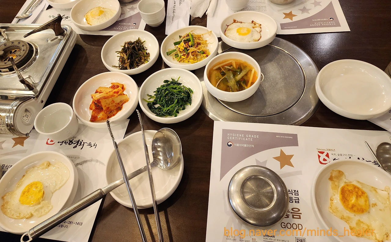 기본 상차림의 모습이에요. 감칠맛 도는 밑반찬들과 함께 계란프라이가 하나씩 올라가 있죠? <영천영화육회>에서 식사를 하면 좋은 점이 바로 이것이에요! 계란프라이를 1인당 하나씩 내어 주기 때문에 꼬소~하게 맛볼 수 있답니다^^