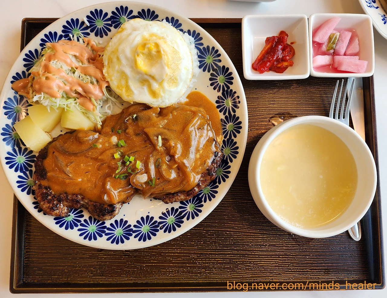 함께 나오는 계란국도 삼삼~하니 맛이 좋아요. 덮밥과 잘 어우러지는 국이랍니다^^