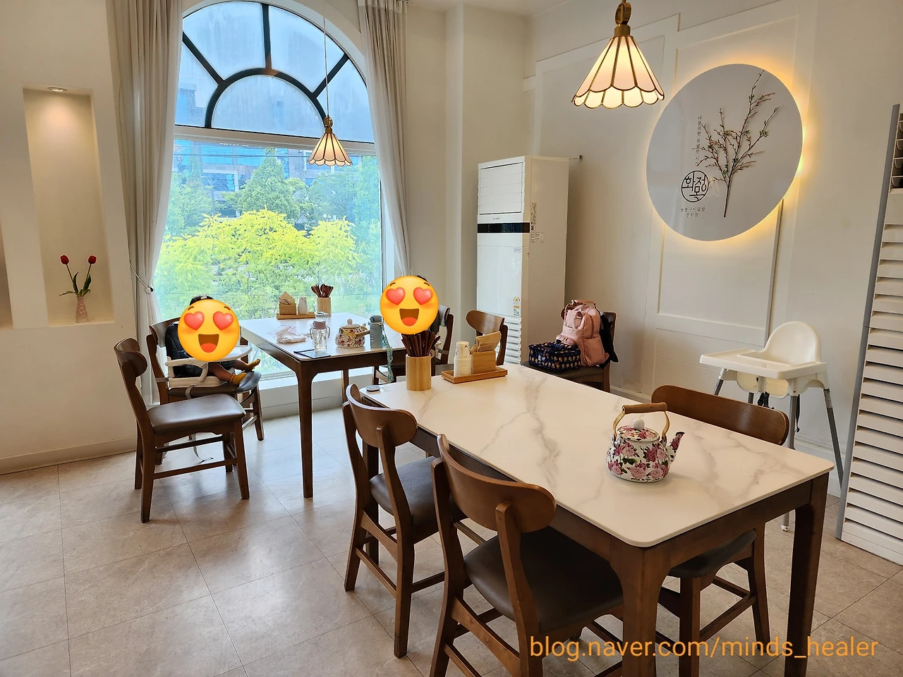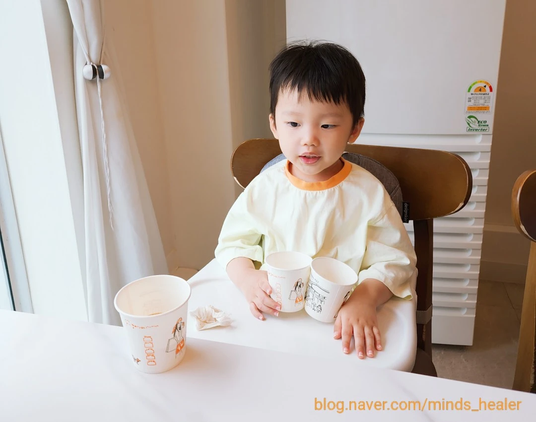 짠~ 식사가 나오기 전, 종이컵에 담긴 물을 마시며 기다리는 첫째와 이미 이유식으로 식사를 마친 둘째입니다^^ 첫째는 배고파서 물 마시는데, 둘째는 든든하게 완밥! 식사가 나오고 이것저것 잘 먹는 첫째를 보니, 고맙고 기분이 좋아졌어요. 역시 아이들이 잘 먹는 것은 저희에게 너무나 큰 기쁨이에요^^