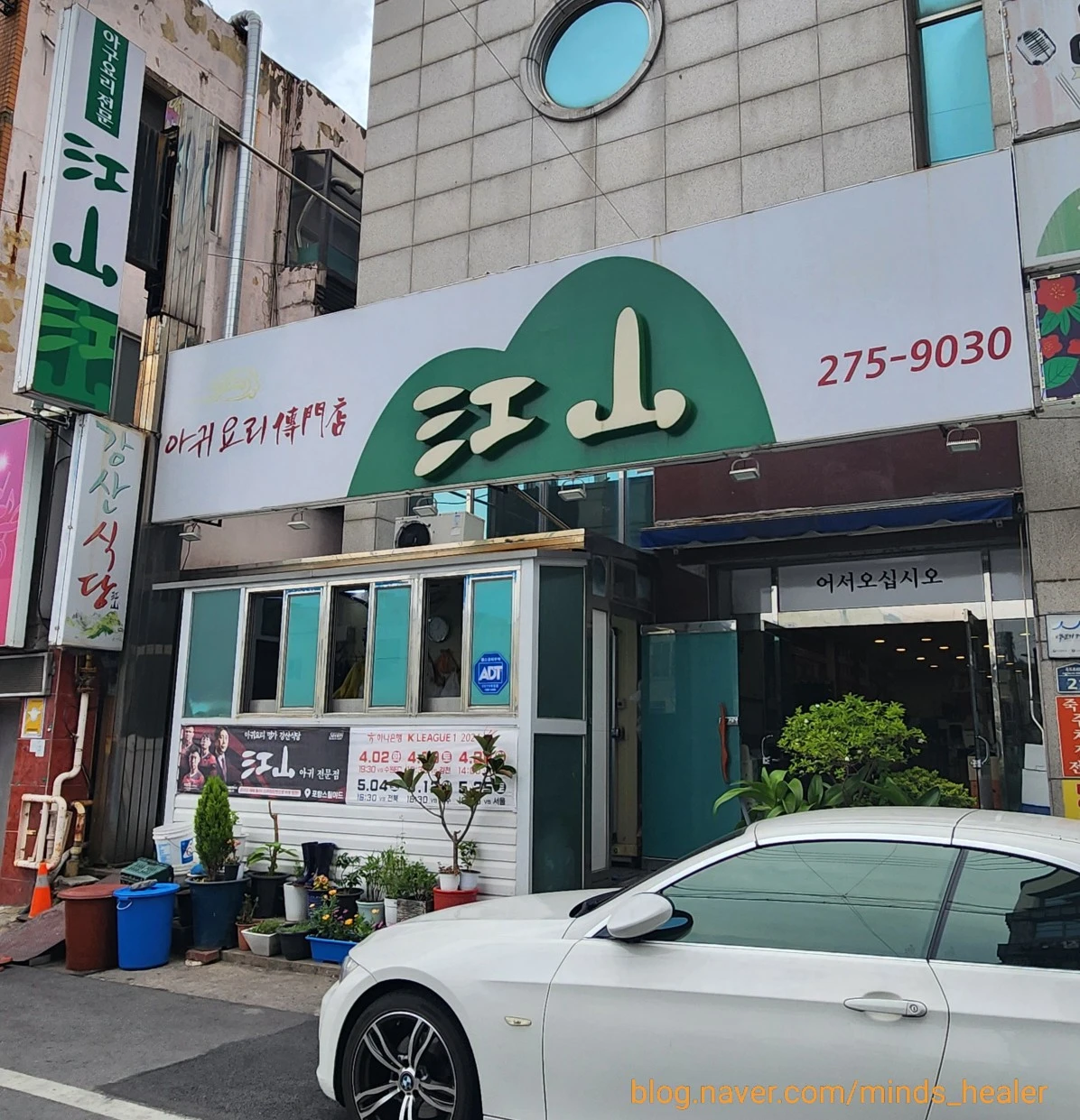 <강산식당>은 30년 전통 아귀요리 전문점이에요. 깔끔하고 눈에 확 들어오는 간판입니다^^
