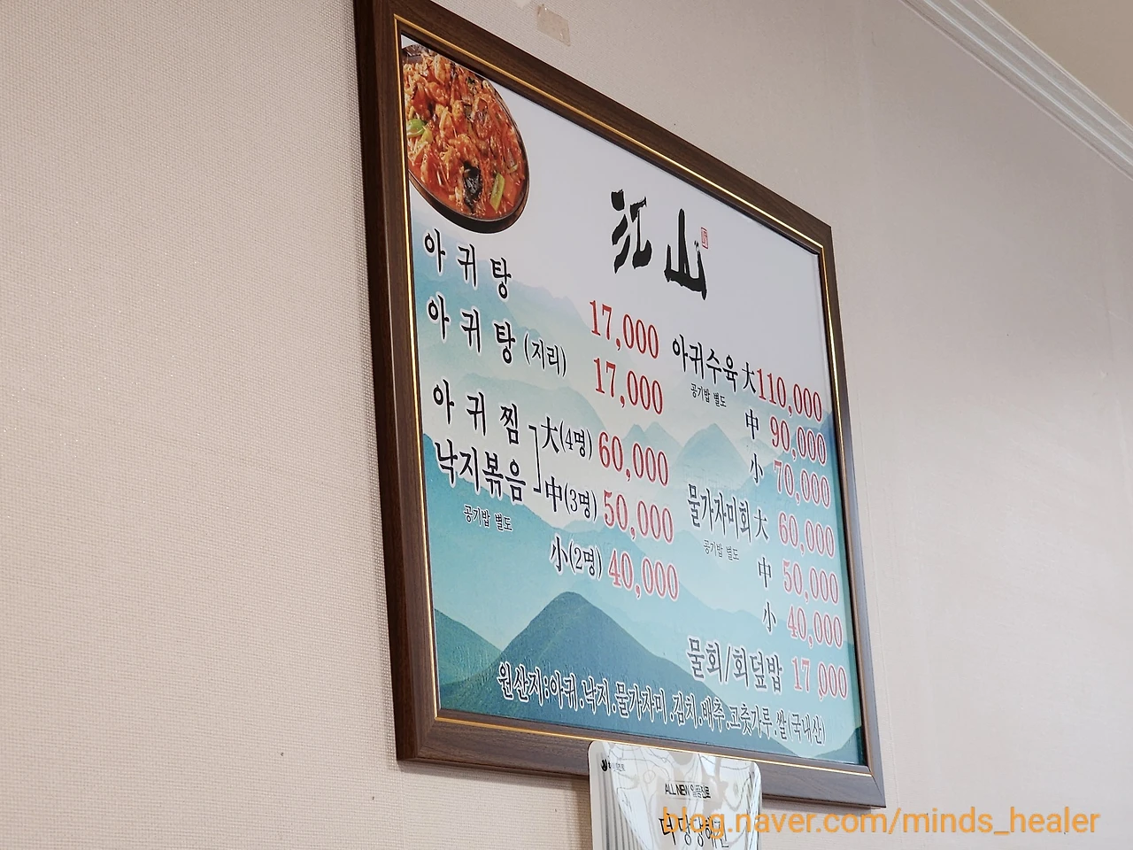 <강산식당>은 아귀요리 전문으로 아귀탕, 아귀찜, 낙지볶음, 아귀수육, 물가자미회, 물회, 회덮밥이 있어요. 다른 테이블을 보니, 아귀요리가 아닌 음식들도 맛나 보였어요^^