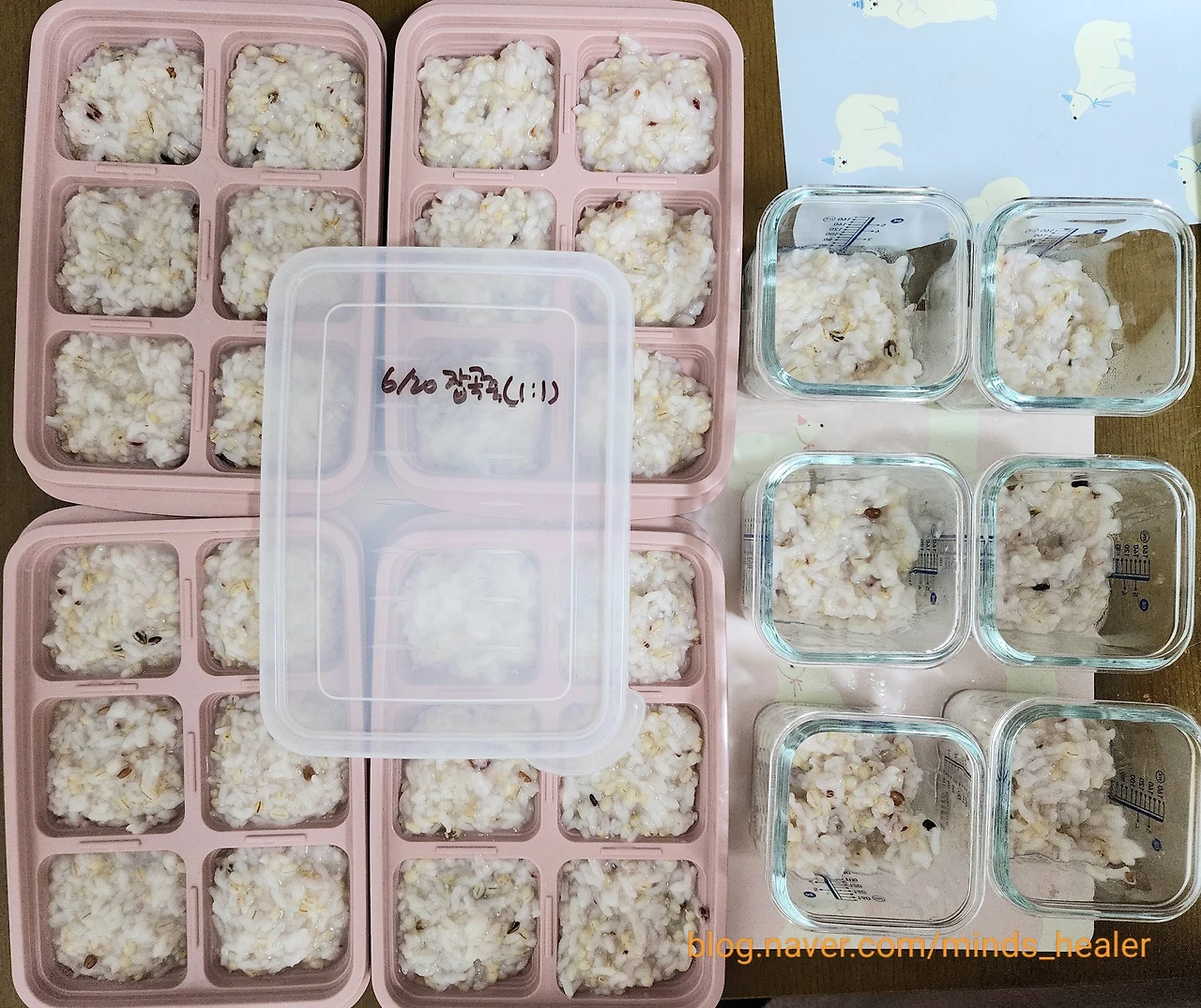 큐브는 냉동실행, 유리 이유식 용기는 냉장실로 가요. 쌀과 잡곡의 비율은 2:1의 비율로 넣어주고 있습니다^^ 돌이 지나면 잡곡의 양을 조금 더 늘릴 예정이에요.