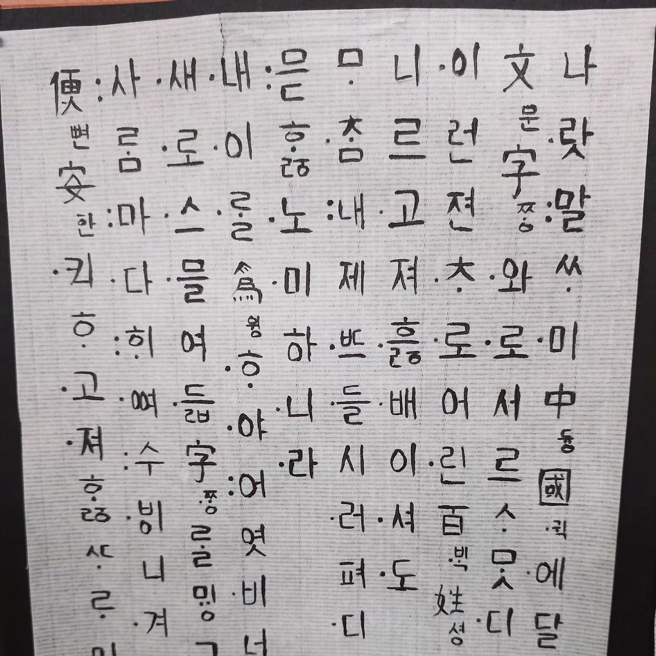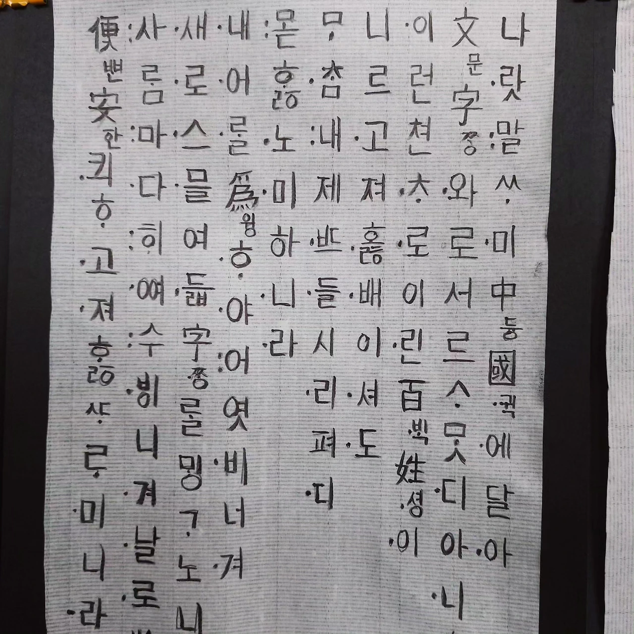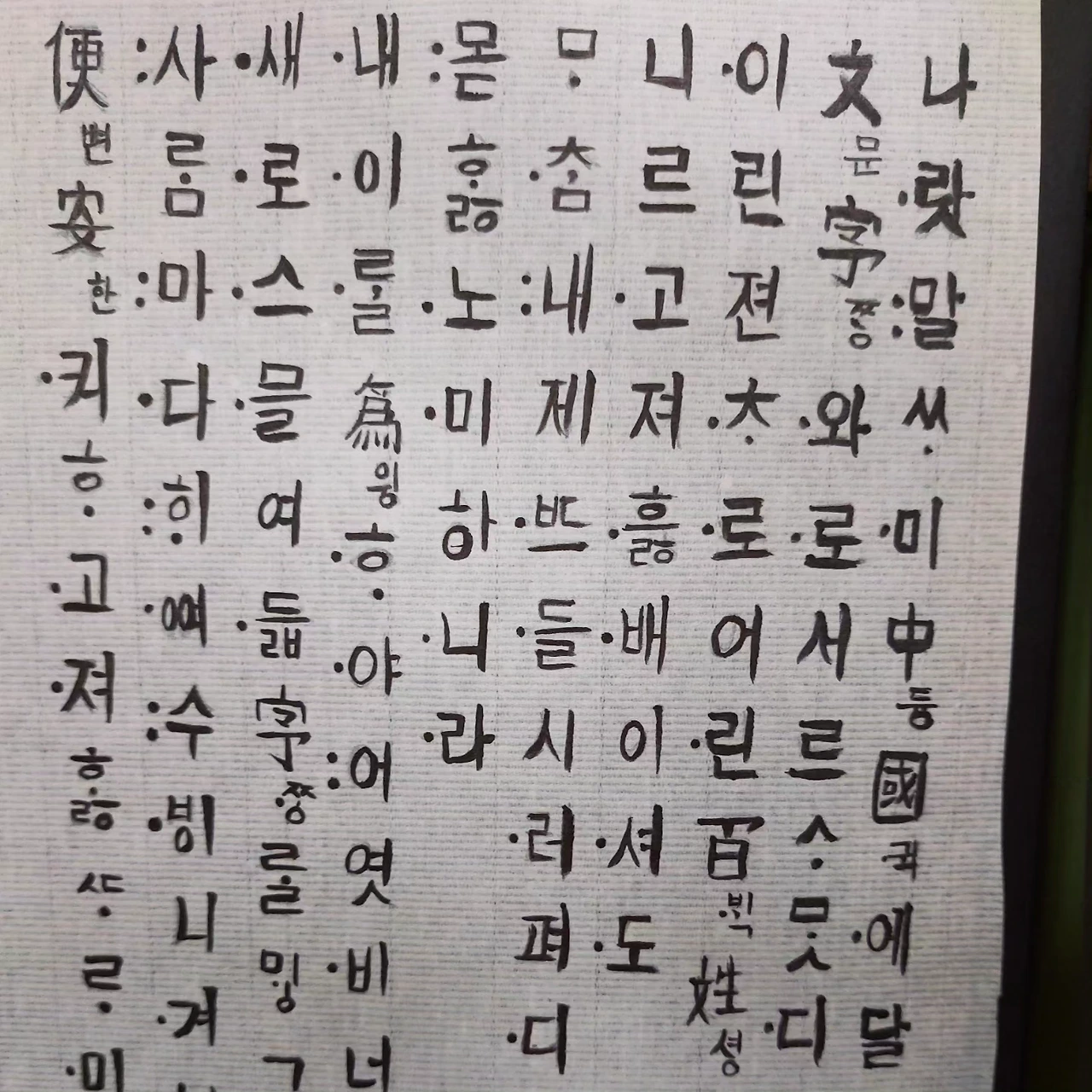 비록 붓펜으로 쓴 훈민정음해례본이지만 반듯하게 써 내려간 글씨체를 보면 이 아이들이 얼마나 열심히 집중했는가를 알 수 있다.