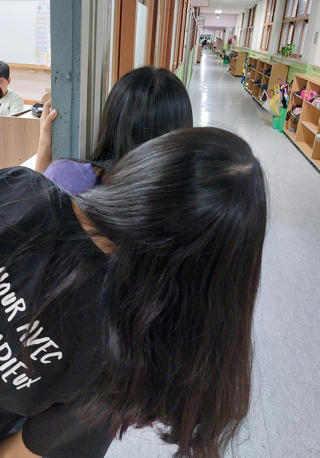 운 좋게 복도 끝 비어 있는 의자를 하나 발견했다. 같은 처지인 실과 선생님께 좌석을 확보했다고 자랑을 하고 있는 찰나 귀염둥이 5학년 친구 두 명이 지나가며 내게 말을 건다.