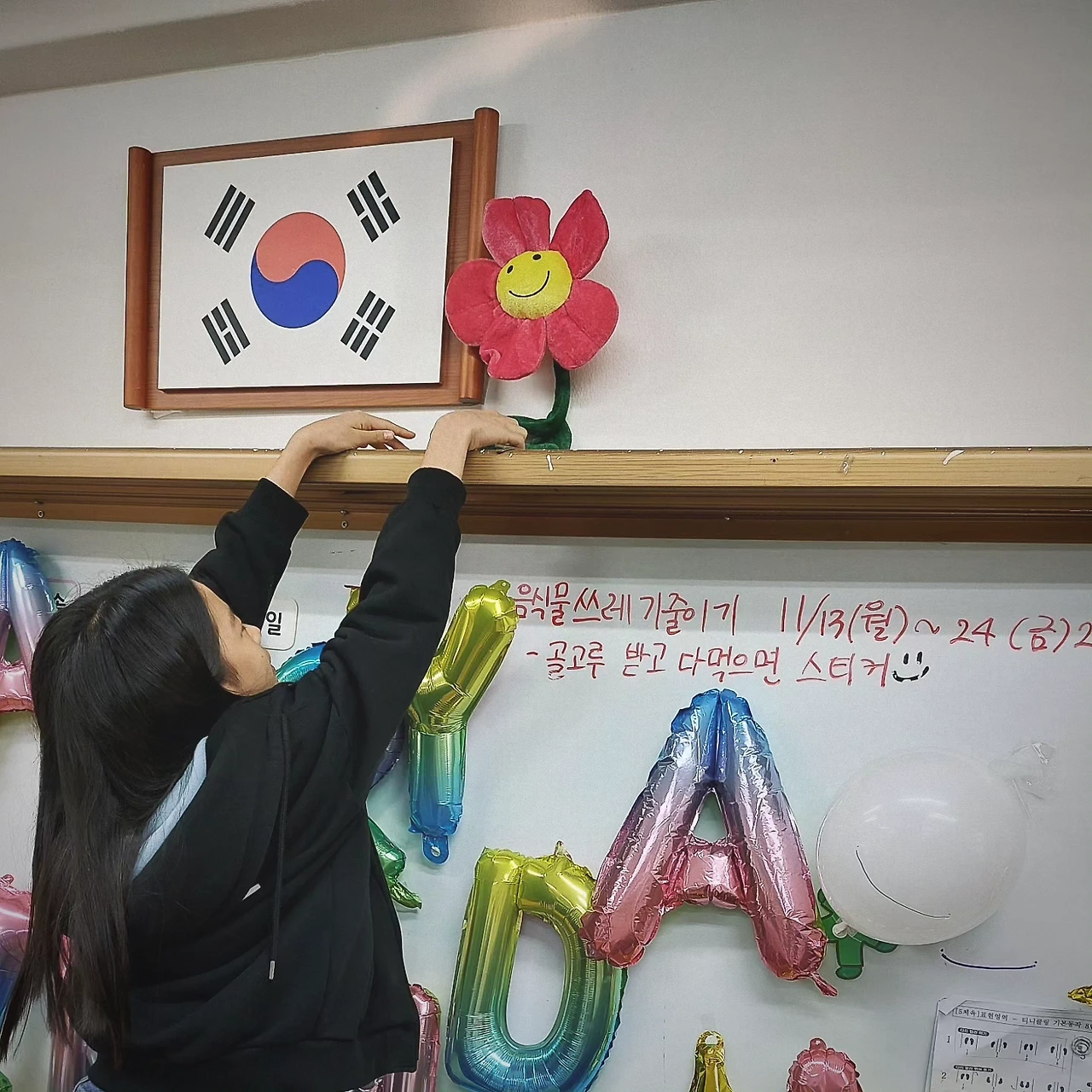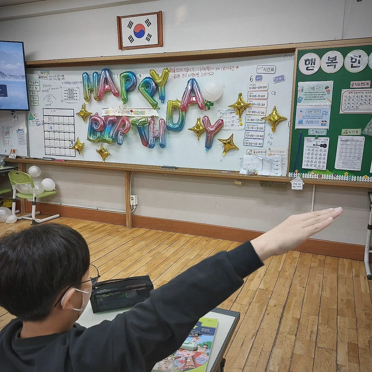 "오늘 아침에 저 풍선 다 불고 칠판에 붙이고 꾸미고 하느라 오픈런, 아니 스쿨런 했다니까요! 우리들 7시 반에 학교 왔어요!"